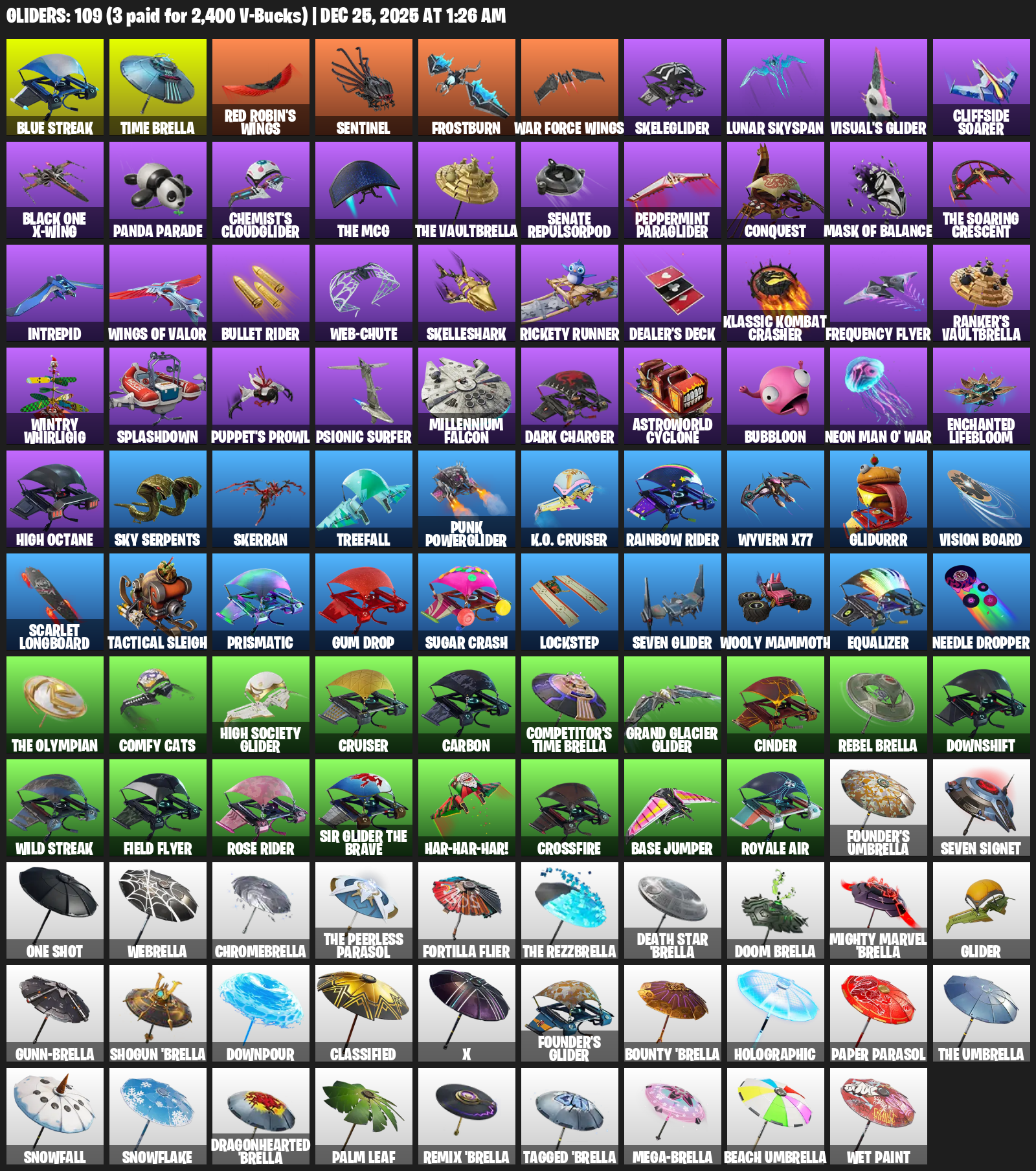 Time Brella, Red Robin’s Wings, Sentinel, Frostburn, Skeleglider, Lunar Skyspan, Visual’s Glider, Cliffside Soarer, Black One X-wing, Panda Parade, Chemist’s Cloudglider, Senate Repulsorpod, Peppermint Paraglider, Conquest, Mask of Balance