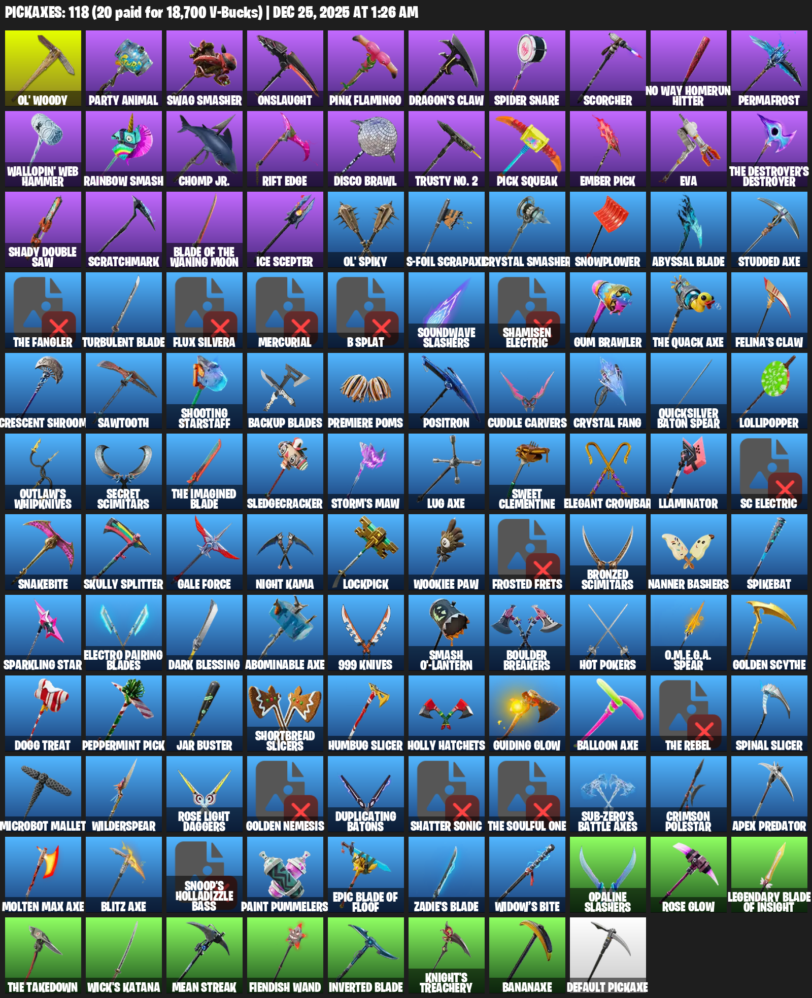 Ol’ Woody, Party Animal, Swag Smasher, Onslaught, Pink Flamingo, Dragon’s Claw, Spider Snare, Scorcher, No Way Homerun Hitter, Permafrost, Wallopin’ Web Hammer, Rainbow Smash, Chomp Jr., Rift Edge, Disco Brawl, Trusty No. 2, Pick Squeak, EVA