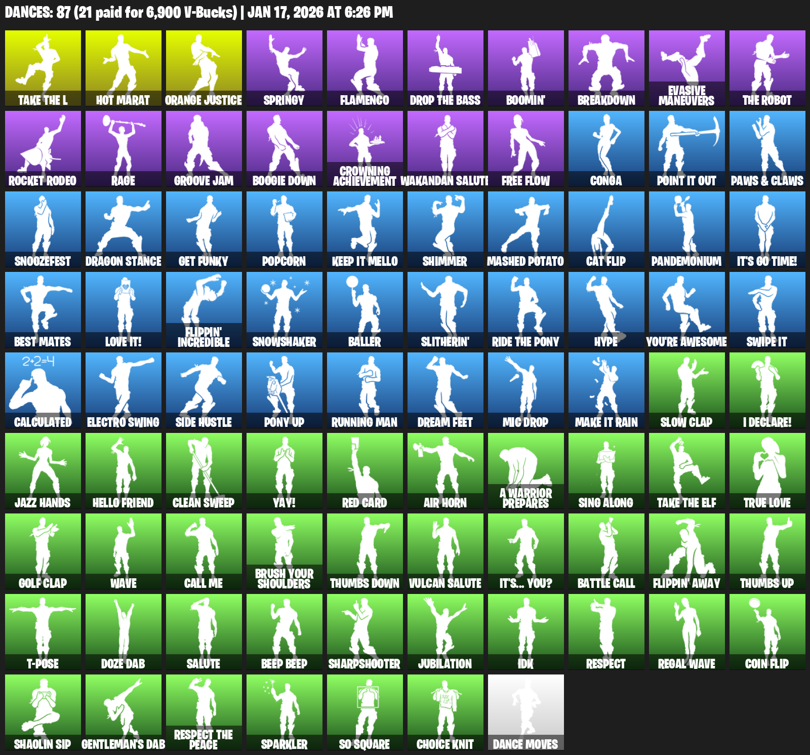 Hot Marat, Springy, Flamenco, Boomin’, Breakdown, Evasive Maneuvers, Rocket Rodeo, Rage, Groove Jam, Boogie Down, Crowning Achievement, Wakandan Salute, Free Flow, Conga, Paws & Claws