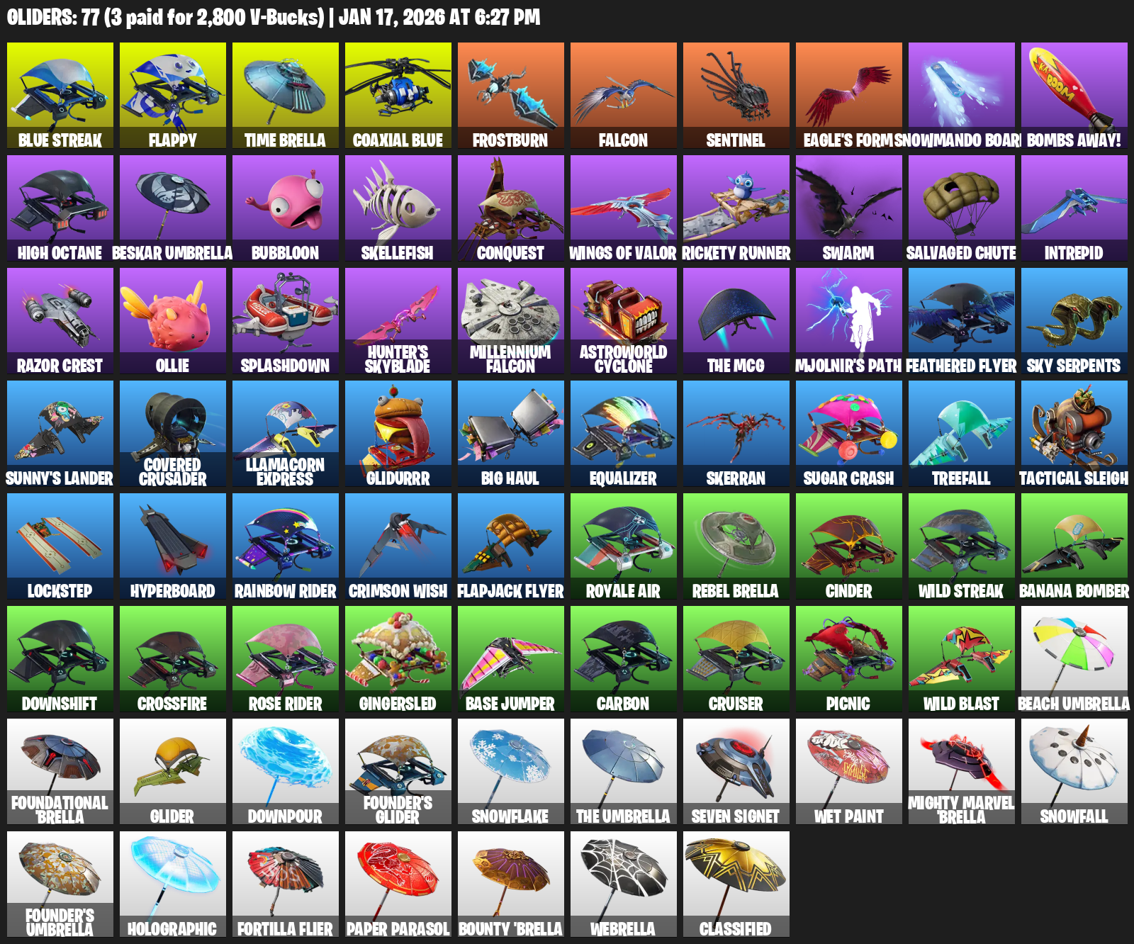 Flappy, Time Brella, Frostburn, Falcon, Sentinel, Eagle’s Form, Snowmando Board, Bombs Away!, High Octane, Beskar Umbrella, Bubbloon, Skellefish, Conquest, Rickety Runner, Swarm, Salvaged Chute, Intrepid