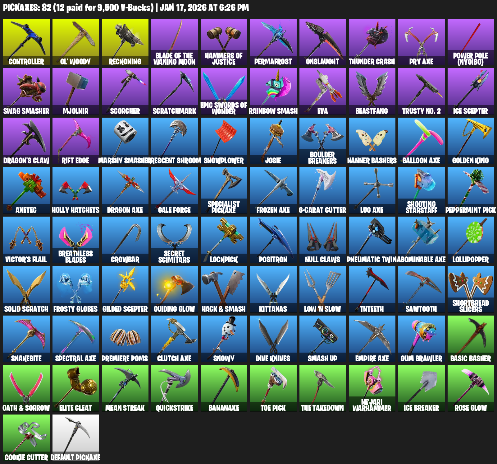 Controller, Ol’ Woody, Reckoning, Hammers of Justice, Permafrost, Onslaught, Thunder Crash, Pry Axe, Power Pole (Nyoibo), Swag Smasher, Mjolnir, Scorcher, Scratchmark, Rainbow Smash, EVA, Beastfang, Trusty No. 2, Ice Scepter