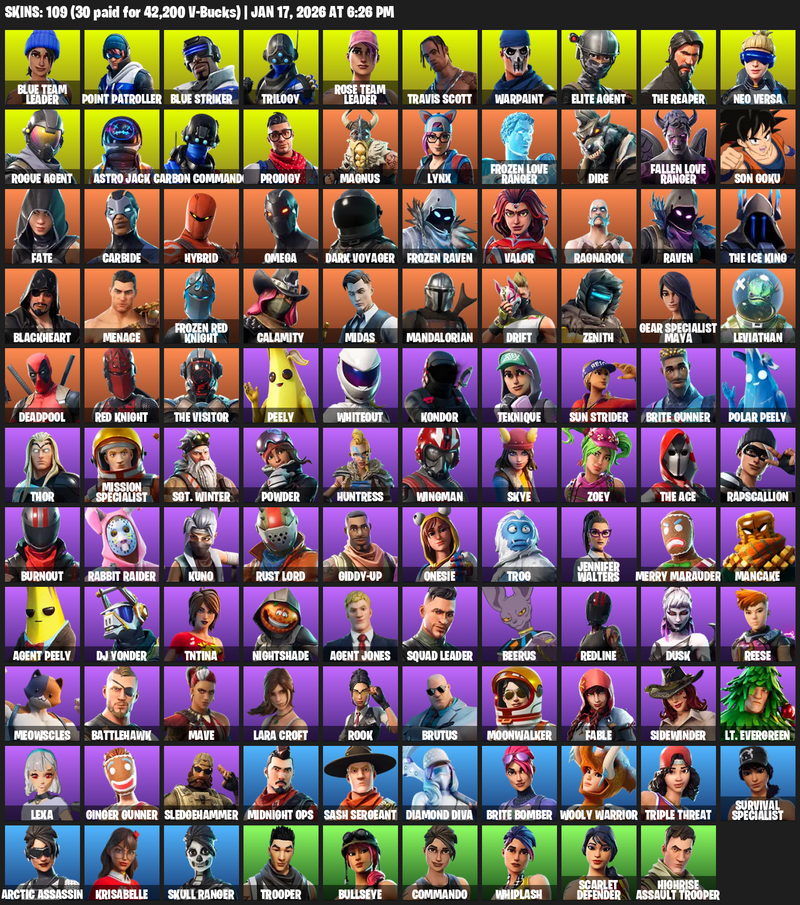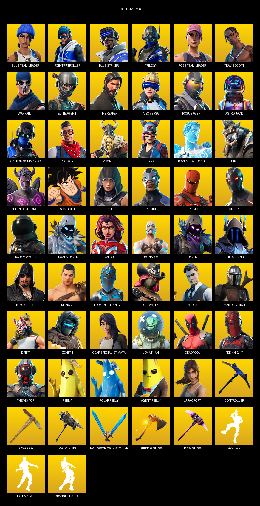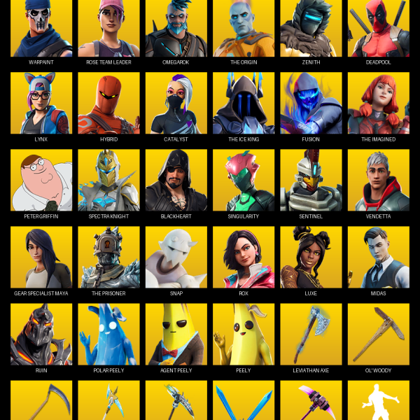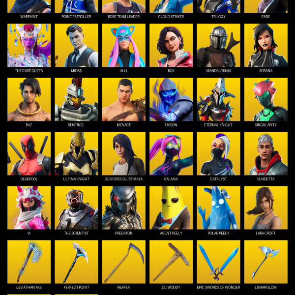 Point Patroller, Travis Scott, Elite Agent, The Reaper, Omega, Gear Specialist Maya, Lara Croft, Blue Team Leader, Trilogy, Warpaint, Neo Versa, Astro Jack, Carbon Commando, Prodigy, Magnus, Lynx, Frozen Love Ranger