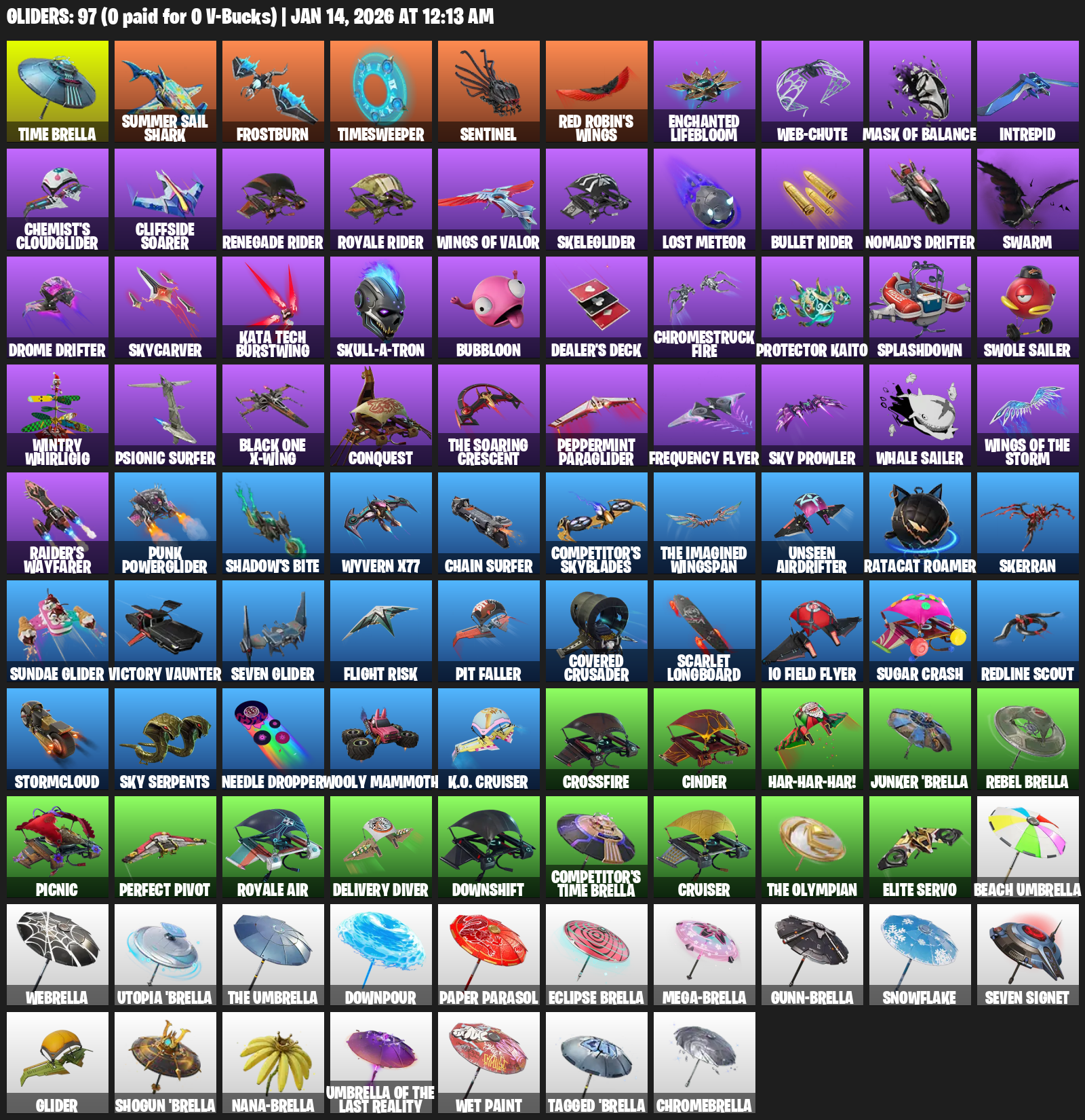 Time Brella, Summer Sail Shark, Frostburn, Timesweeper, Sentinel, Red Robin’s Wings, Enchanted Lifebloom, Web-Chute, Mask of Balance, Intrepid, Chemist’s Cloudglider, Cliffside Soarer, Renegade Rider, Skeleglider, Lost Meteor, Swarm