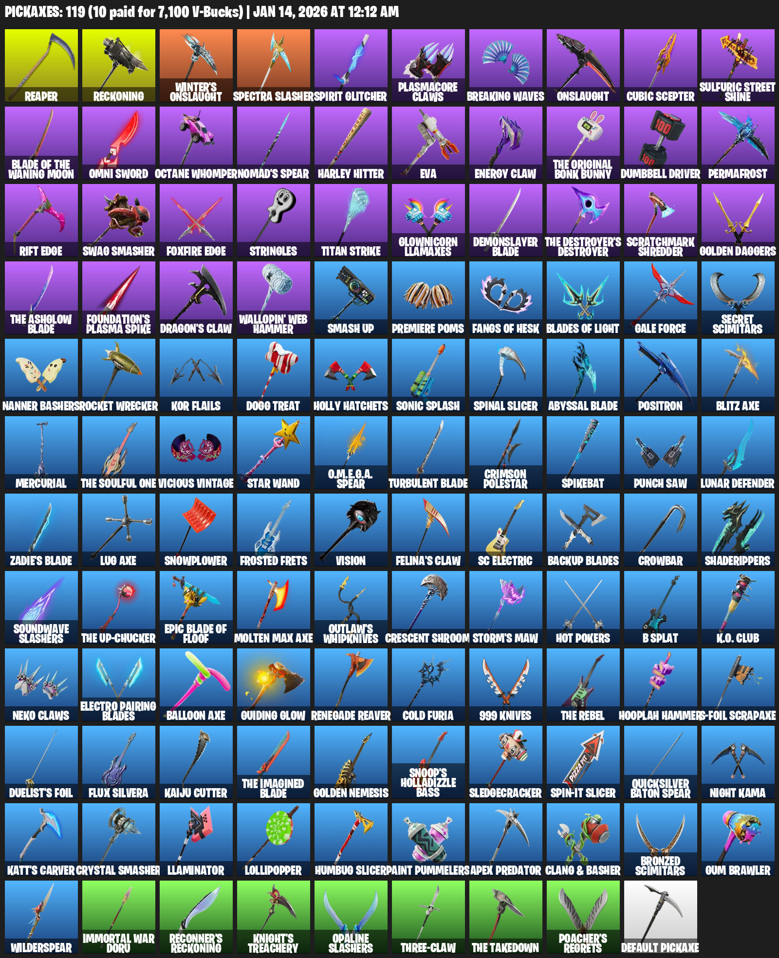 Reaper, Reckoning, Winter’s Onslaught, Spirit Glitcher, Plasmacore Claws, Breaking Waves, Cubic Scepter, Sulfuric Street Shine, Omni Sword, Octane Whomper, Nomad’s Spear, Harley Hitter, EVA, Energy Claw, Dumbbell Driver, Permafrost