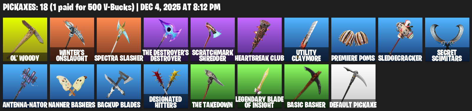Ol’ Woody, Winter’s Onslaught, The Destroyer’s Destroyer, Scratchmark Shredder, Utility Claymore, Premiere Poms, Sledgecracker, Secret Scimitars, Antenna-nator, Nanner Bashers, Backup Blades, Designated Hitters, Legendary Blade of Insight, Basic Basher, Default Pickaxe