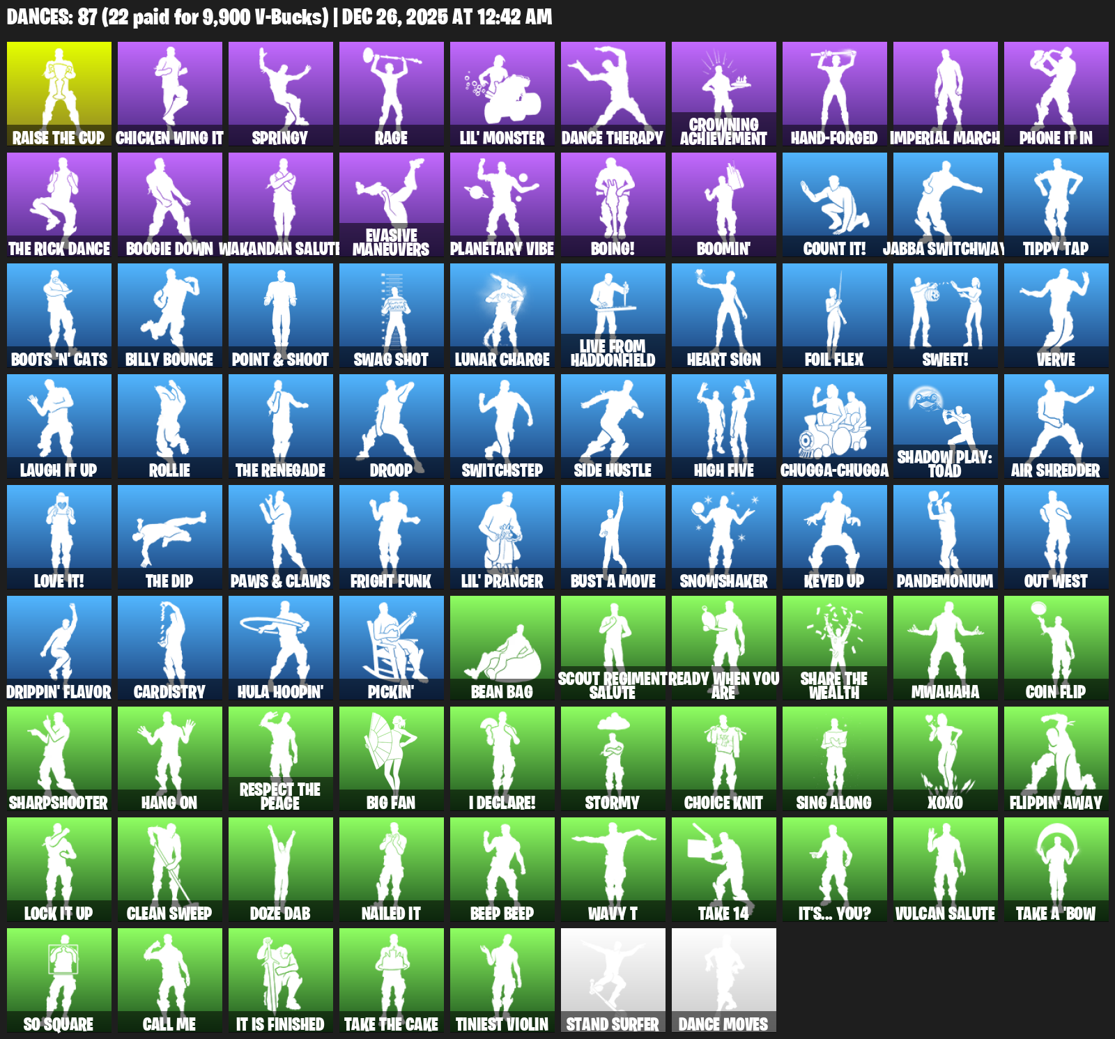 Chicken Wing It, Springy, Rage, Lil’ Monster, Dance Therapy, Crowning Achievement, Imperial March, Boogie Down, Wakandan Salute, Evasive Maneuvers, Planetary Vibe, Boing!, Boomin’, Count It!, Jabba Switchway, Tippy Tap