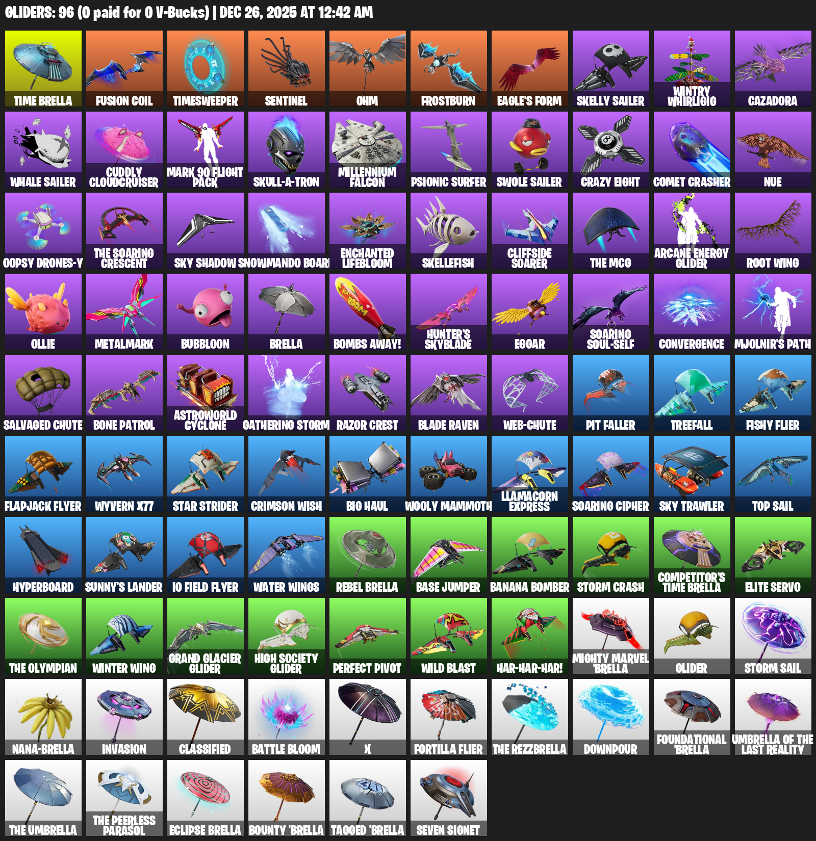 Time Brella, Timesweeper, Sentinel, Ohm, Frostburn, Eagle’s Form, Skelly Sailer, Wintry Whirligig, Cazadora, Cuddly Cloudcruiser, Skull-a-tron, Millennium Falcon, Psionic Surfer, Crazy Eight, Comet Crasher, Nue