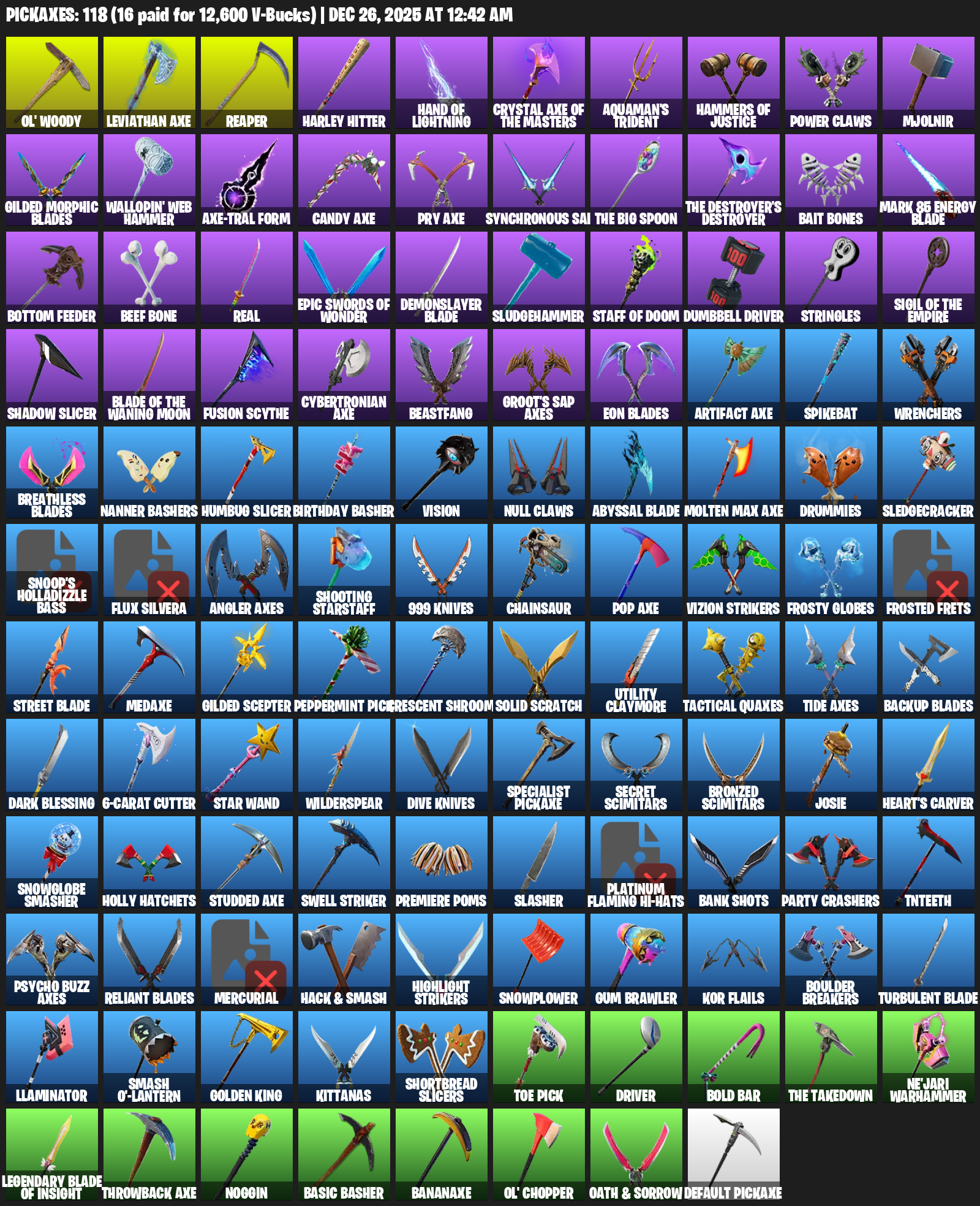 Leviathan Axe, Ol’ Woody, Reaper, Harley Hitter, Hand of Lightning, Aquaman’s Trident, Power Claws, Mjolnir, Gilded Morphic Blades, Wallopin’ Web Hammer, Synchronous Sai, Bait Bones, Mark 85 Energy Blade