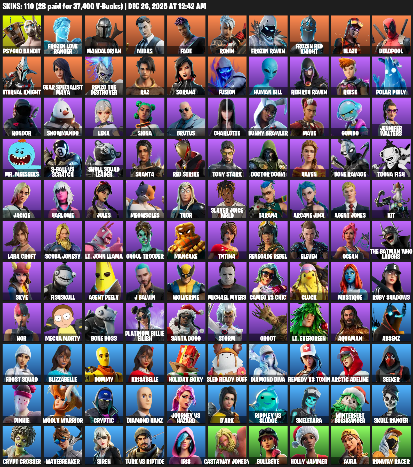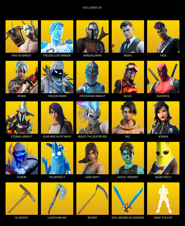[PC/PSN/XBOX] | 110 skins | Leviathan Axe | Lara Croft | Psycho Bandit | Frozen Love Ranger | Mandalorian | Midas | Fade | Ronin | #BCU0103