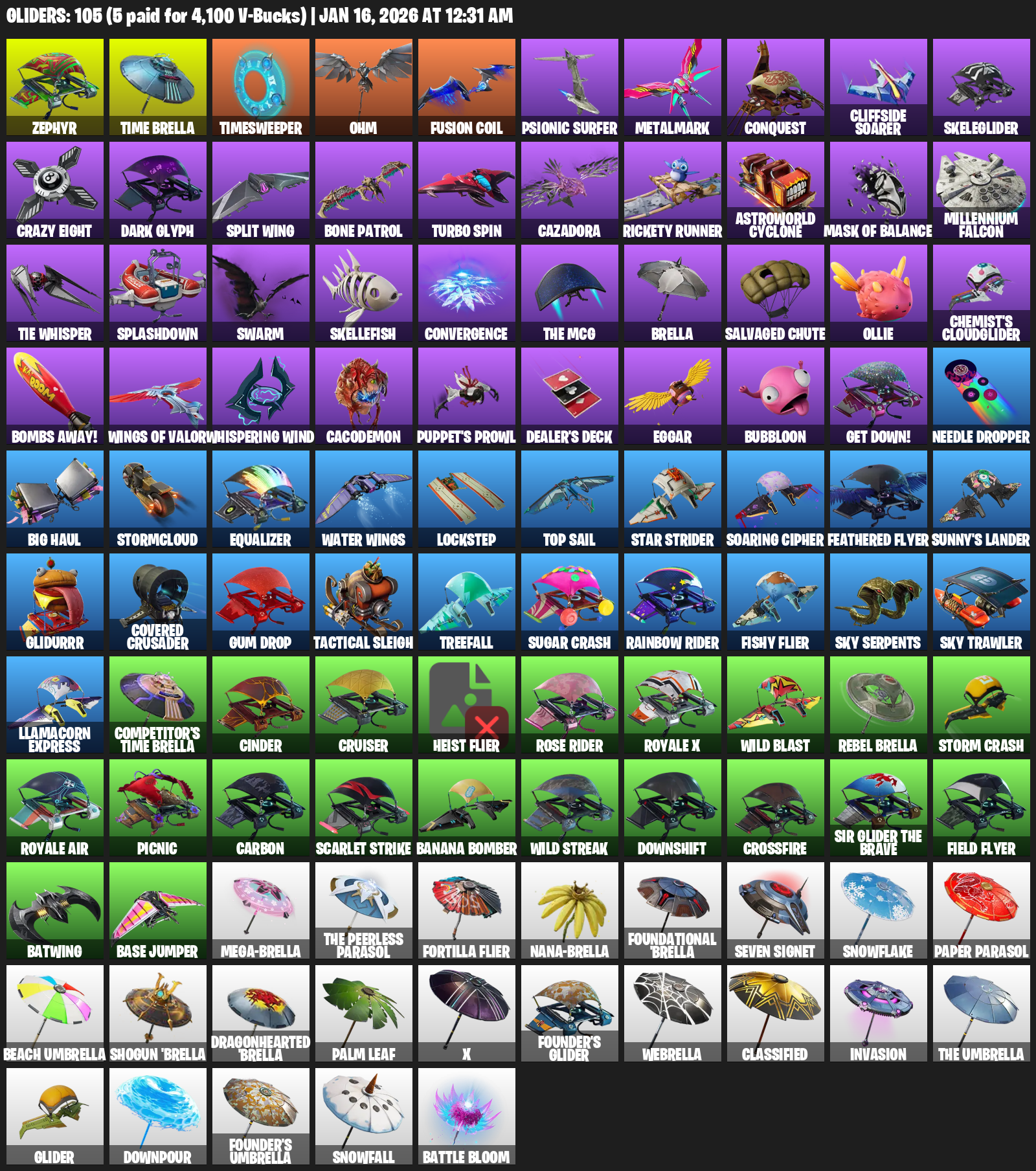 Zephyr, Time Brella, Timesweeper, Ohm, Psionic Surfer, Metalmark, Conquest, Cliffside Soarer, Skeleglider, Crazy Eight, Dark Glyph, Split Wing, Bone Patrol, Turbo Spin, Cazadora, Rickety Runner, Astroworld Cyclone, Mask of Balance, Millennium Falcon