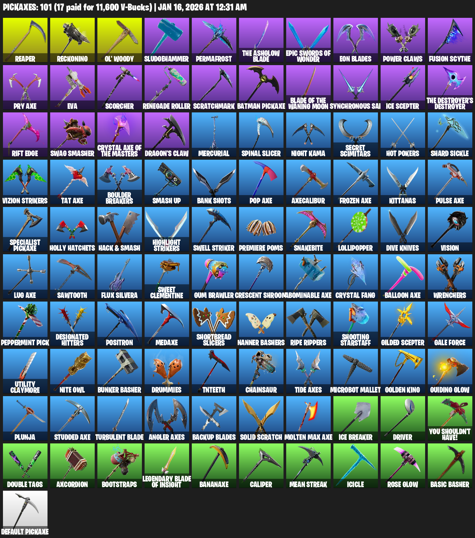 Reaper, Reckoning, Ol’ Woody, Sludgehammer, Permafrost, Eon Blades, Power Claws, Pry Axe, EVA, Scorcher, Renegade Roller, Scratchmark, Batman Pickaxe, Synchronous Sai