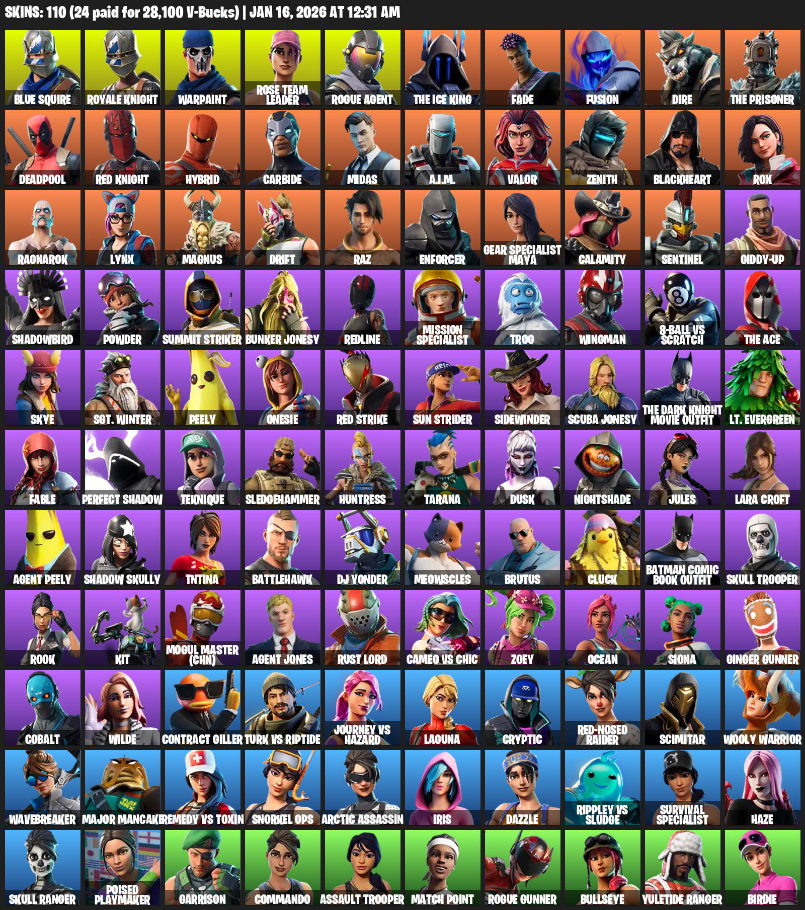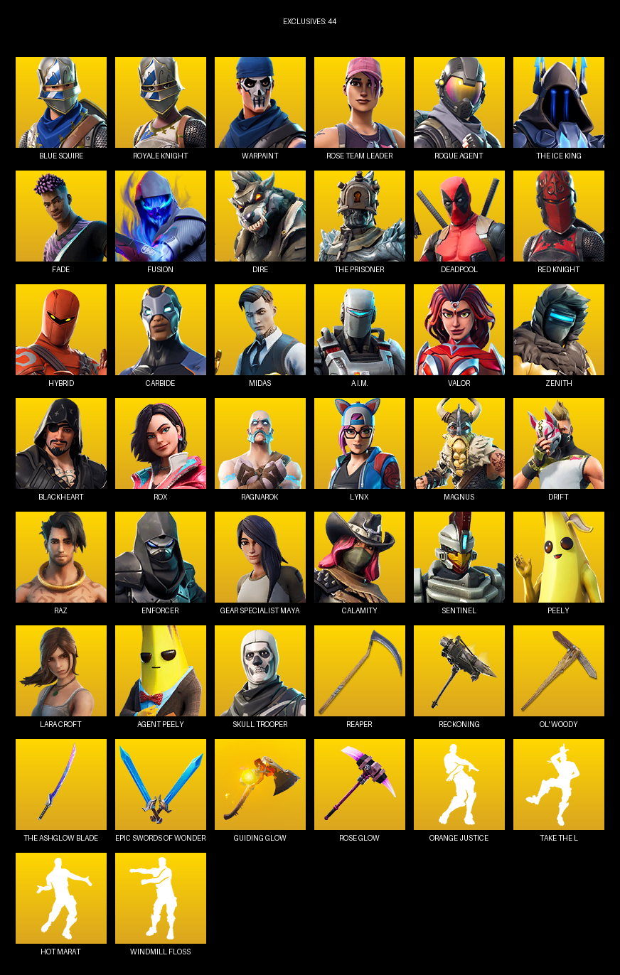Blue Squire, Royale Knight, Gear Specialist Maya, Lara Croft, Warpaint, Rose Team Leader, Rogue Agent, The Ice King, Fade, Fusion, Dire, Deadpool, Hybrid, Carbide, Midas, A.I.M., Valor, Zenith
