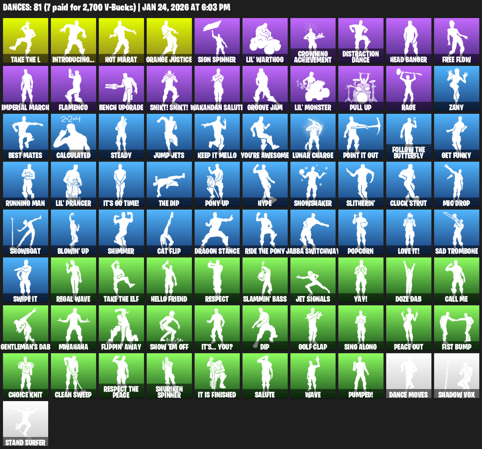 Introducing…, Hot Marat, Orange Justice, Sign Spinner, Lil’ Warthog, Crowning Achievement, Distraction Dance, Head Banger, Free Flow, Imperial March, Flamenco, Bench Upgrade, Snikt! Snikt!, Wakandan Salute, Groove Jam, Pull Up, Rage, Zany