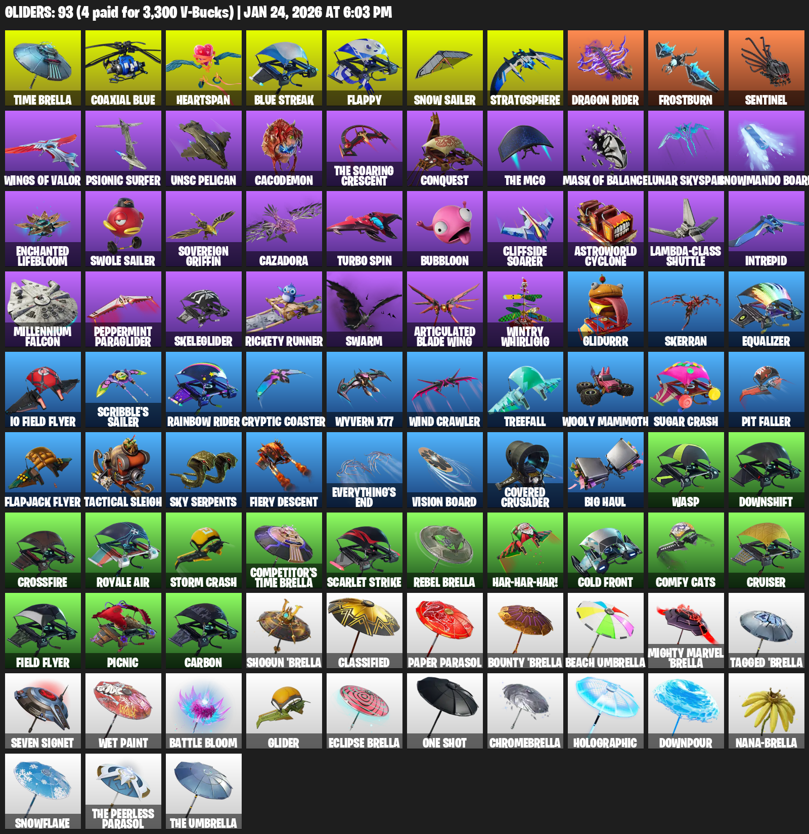 Time Brella, Heartspan, Flappy, Snow Sailer, Stratosphere, Frostburn, Wings of Valor, Psionic Surfer, UNSC Pelican, Cacodemon, Conquest, Lunar Skyspan, Snowmando Board