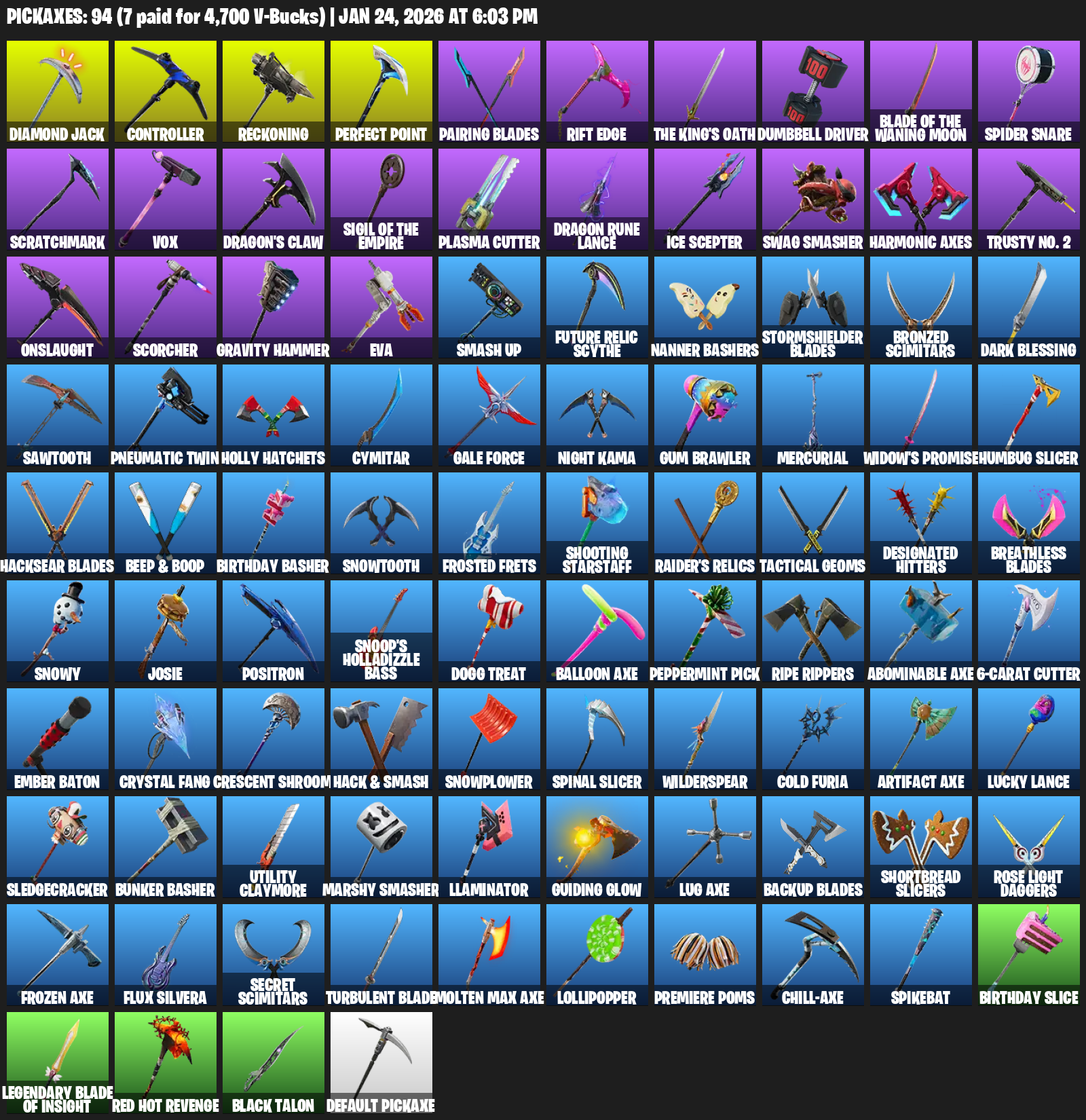 Controller, Reckoning, Pairing Blades, Rift Edge, The King’s Oath, Dumbbell Driver, Spider Snare, Scratchmark, Vox, Dragon’s Claw, Plasma Cutter, Dragon Rune Lance, Ice Scepter, Swag Smasher, Harmonic Axes, Trusty No. 2