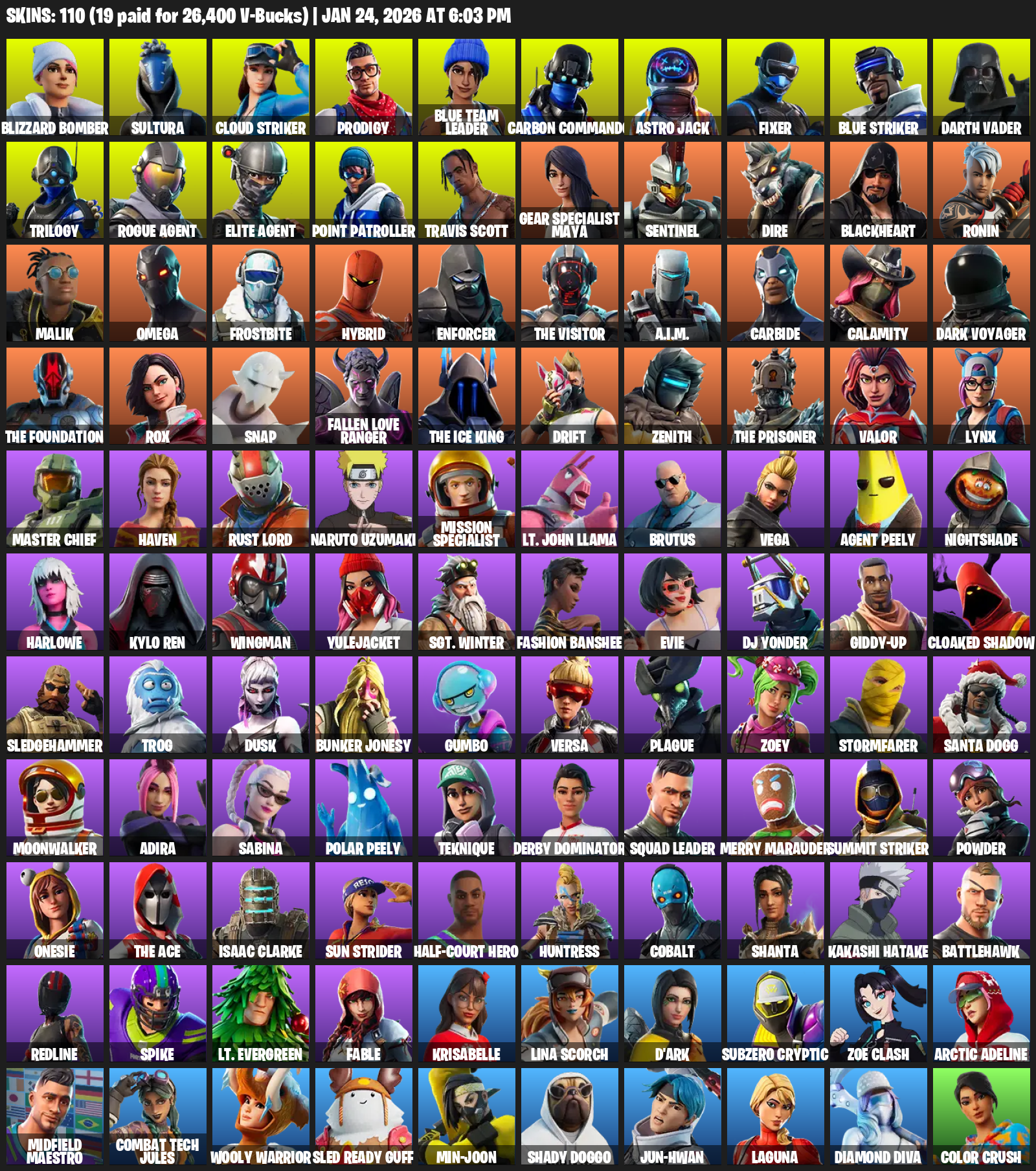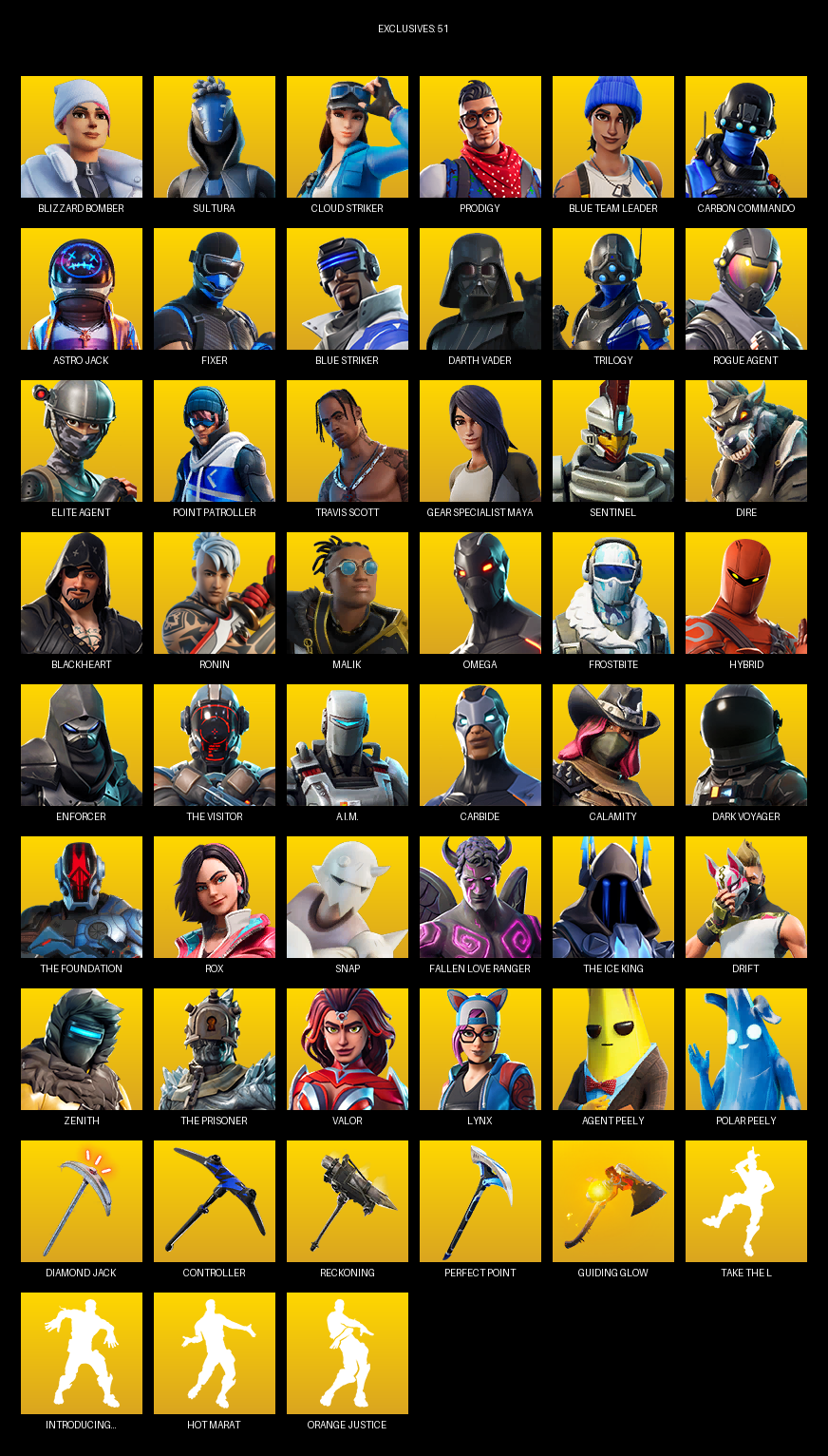 Elite Agent, Point Patroller, Travis Scott, Gear Specialist Maya, Omega, Blizzard Bomber, Sultura, Cloud Striker, Prodigy, Blue Team Leader, Carbon Commando, Astro Jack, Fixer, Darth Vader, Trilogy, Sentinel, Dire, Blackheart