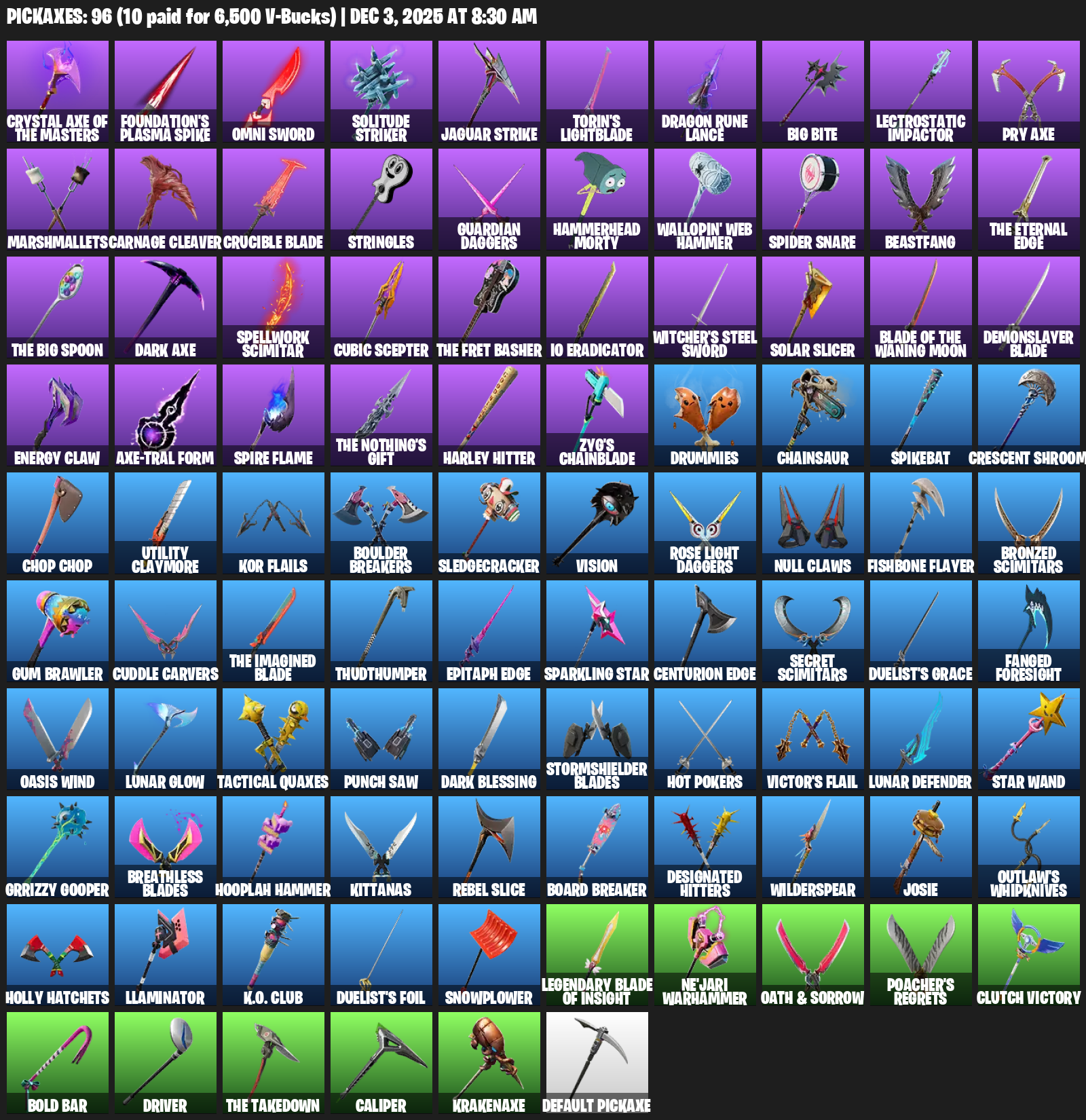 Foundation’s Plasma Spike, Omni Sword, Solitude Striker, Jaguar Strike, Torin’s Lightblade, Dragon Rune Lance, Big Bite, Lectrostatic Impactor, Pry Axe, Marshmallets, Carnage Cleaver, Crucible Blade, Stringles, Guardian Daggers, Hammerhead Morty, Wallopin’ Web Hammer, Spider Snare, Beastfang