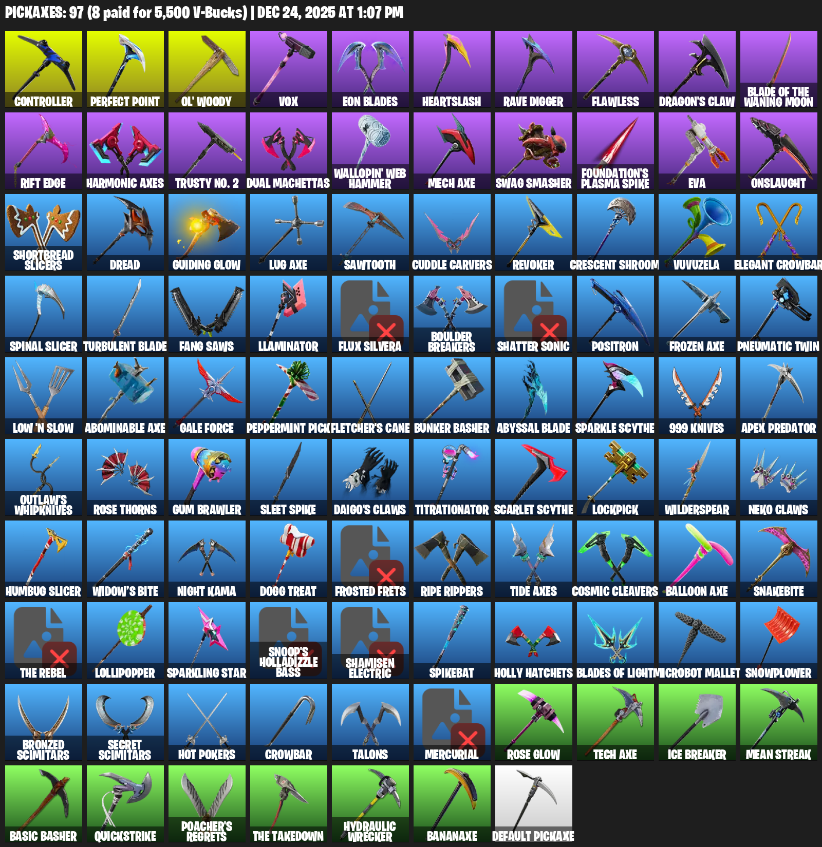Controller, Ol’ Woody, Vox, Eon Blades, Heartslash, Rave Digger, Flawless, Dragon’s Claw, Rift Edge, Harmonic Axes, Trusty No. 2, Dual Machettas, Wallopin’ Web Hammer, Mech Axe, Swag Smasher, Foundation’s Plasma Spike, EVA, Onslaught