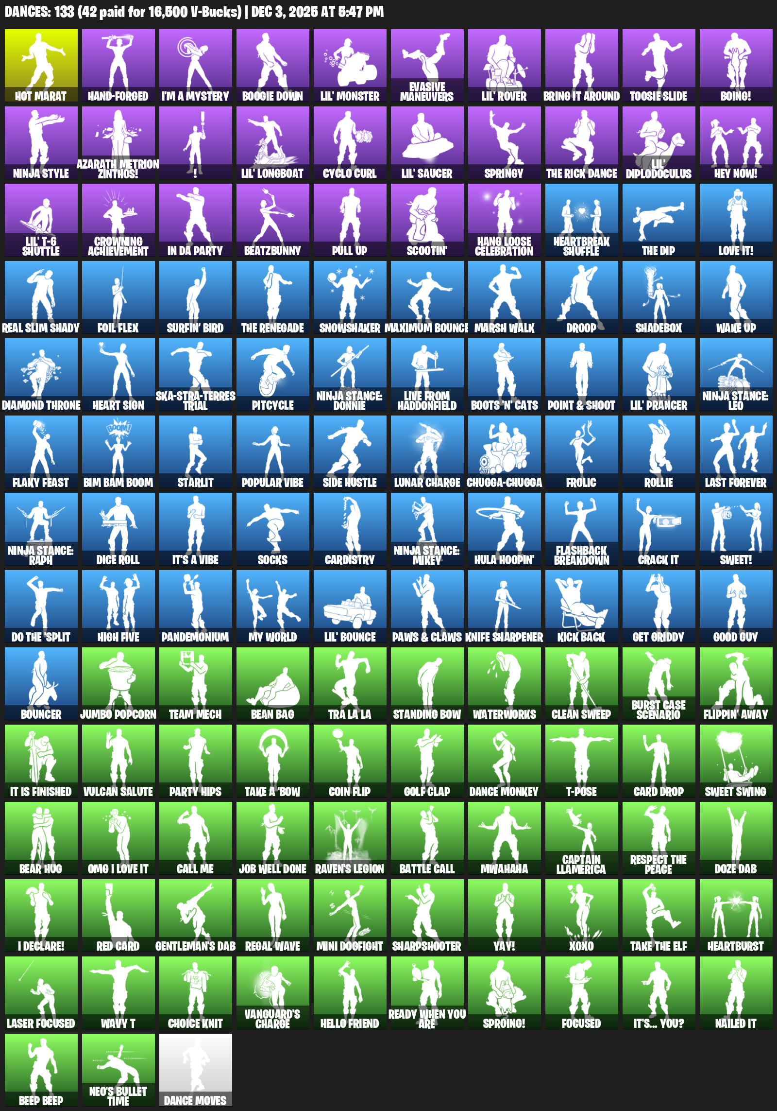 Hot Marat, Hand-Forged, I’m a Mystery, Boogie Down, Lil’ Monster, Evasive Maneuvers, Bring it around, Toosie Slide, Boing!, Ninja Style, Azarath Metrion Zinthos!, !, Cyclo Curl, Springy, Hey Now!