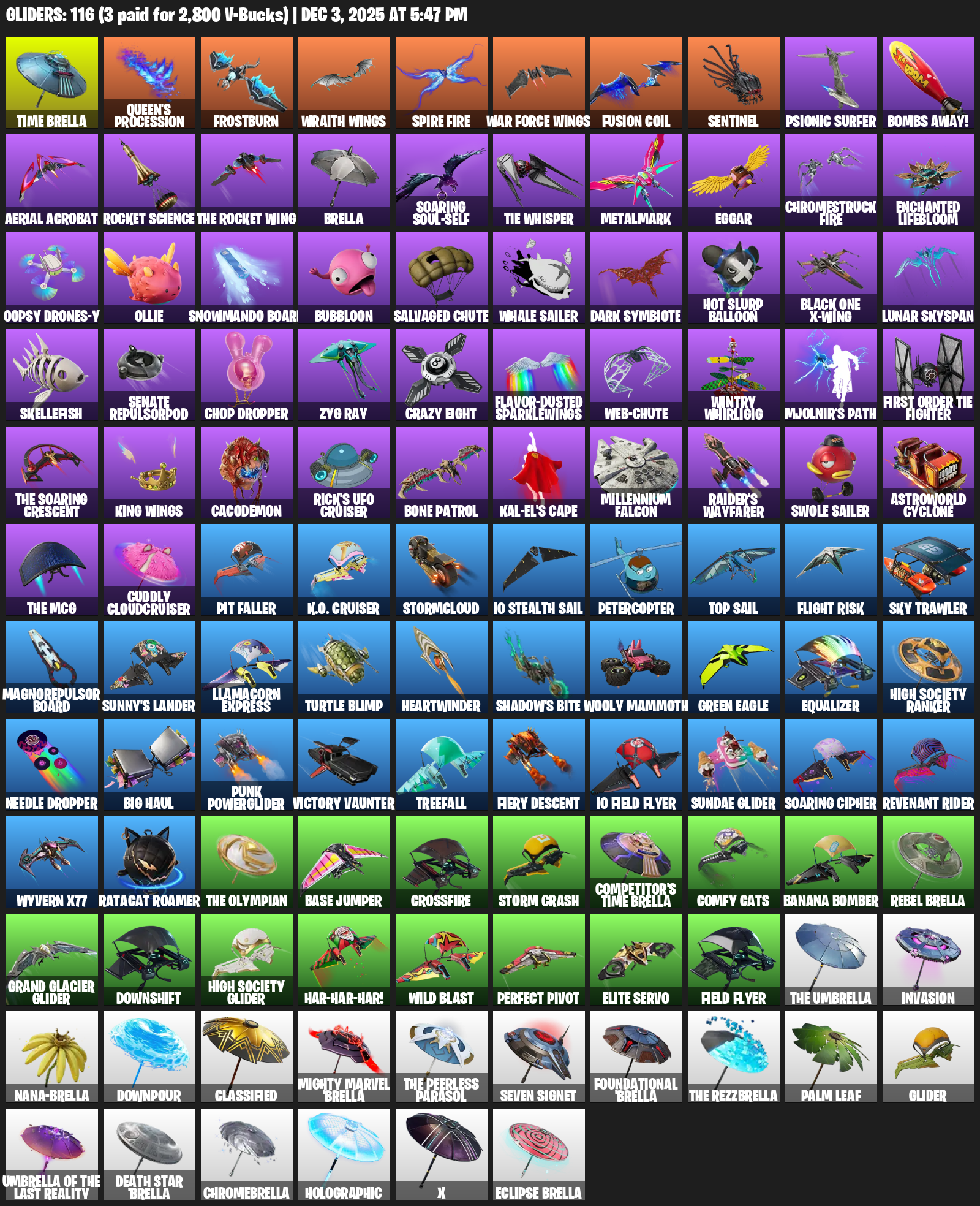 Time Brella, Queen’s Procession, Frostburn, Wraith Wings, Sentinel, Psionic Surfer, Bombs Away!, Aerial Acrobat, Rocket Science, Soaring Soul-Self, TIE Whisper, Metalmark, Eggar, Chromestruck Fire, Enchanted Lifebloom