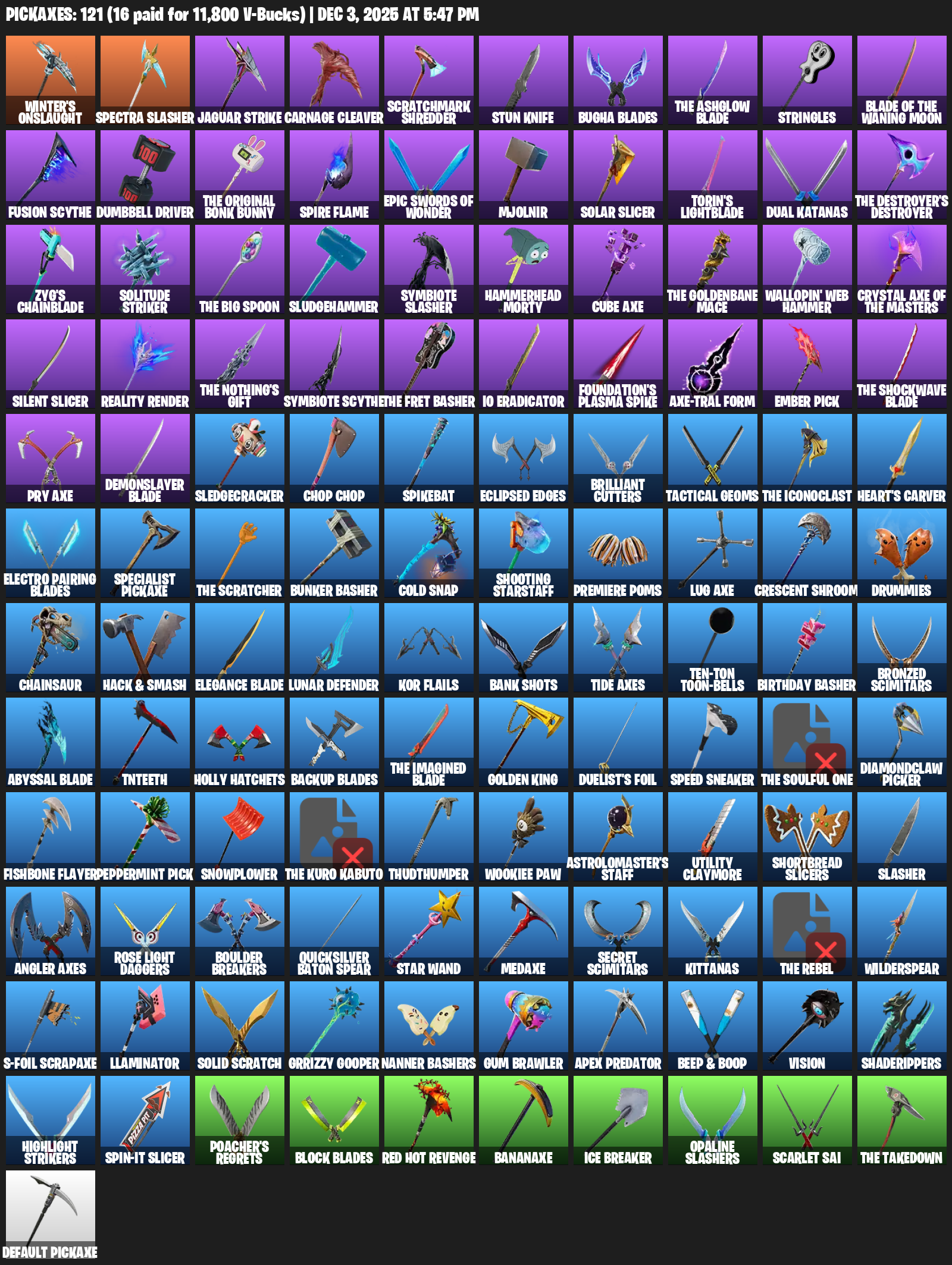 Winter’s Onslaught, Jaguar Strike, Carnage Cleaver, Scratchmark Shredder, Stun Knife, Bugha Blades, Stringles, Dumbbell Driver, Mjolnir, Solar Slicer, Torin’s Lightblade, Dual Katanas