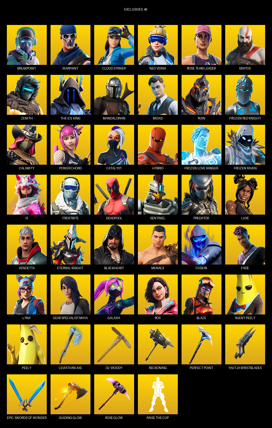 Gear Specialist Maya, Breakpoint, Warpaint, Cloud Striker, Neo Versa, Rose Team Leader, Kratos, Zenith, The Ice King, Mandalorian, Midas, Ruin, Frozen Red Knight, Calamity, Power Chord, Catalyst, Hybrid, Vi