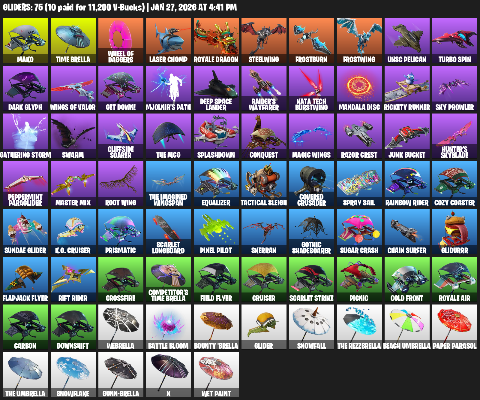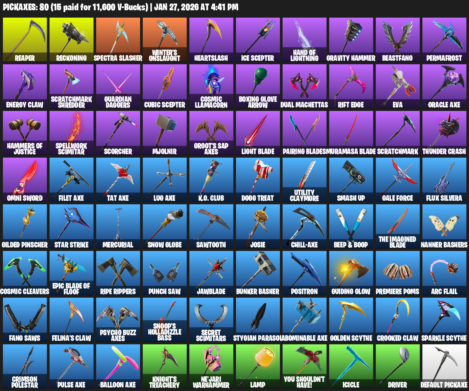 Reaper, Reckoning, Spectra Slasher, Winter’s Onslaught, Heartslash, Hand of Lightning, Gravity Hammer, Beastfang, Permafrost, Energy Claw, Scratchmark Shredder, Guardian Daggers, Cubic Scepter, Cosmic Llamacorn, Boxing Glove Arrow, Dual Machettas, Rift Edge, EVA, Oracle Axe