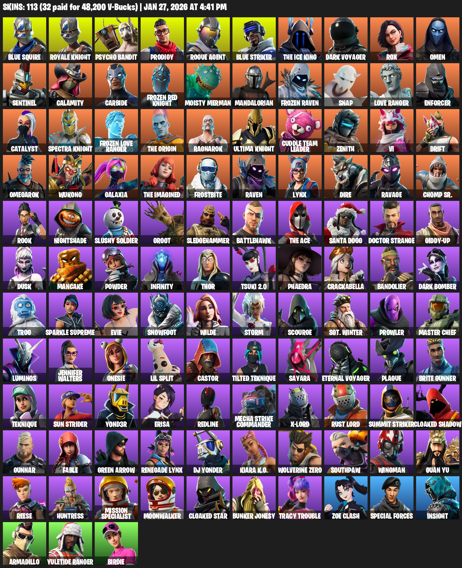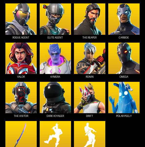 Blue Squire, Royale Knight, Psycho Bandit, Prodigy, Rogue Agent, The Ice King, Dark Voyager, Rox, Omen, Sentinel, Calamity, Carbide, Moisty Merman, Mandalorian, Frozen Raven, Snap, Love Ranger, Enforcer