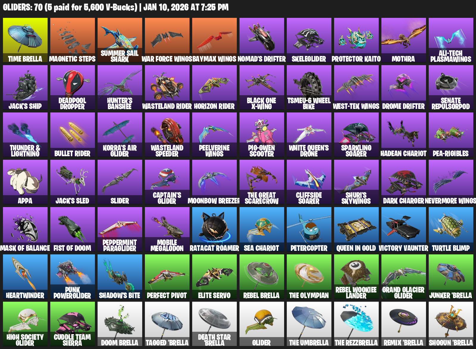 Time Brella, Magnetic Steps, Summer Sail Shark, War Force Wings, Nomad’s Drifter, Skeleglider, Protector Kaito, Mothra, Ali-Tech Plasmawings, Jack’s Ship, Hunter’s Banshee, Wasteland Rider, Black One X-wing, TSMEU-6 Wheel Bike, Senate Repulsorpod