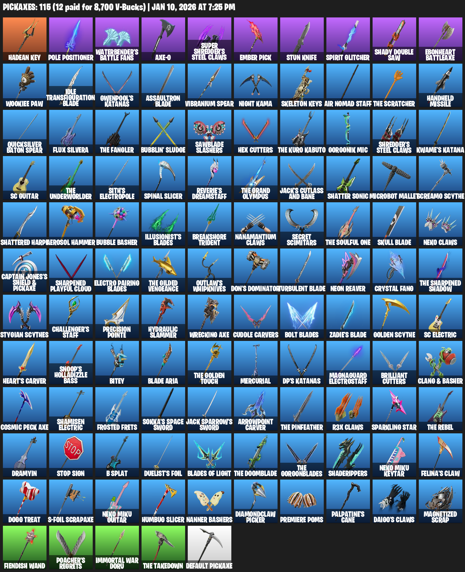 Hadean Key, Pole Positioner, Waterbender’s Battle Fans, aXe-O, Super Shredder’s Steel Claws, Ember Pick, Stun Knife, Spirit Glitcher, Shady Double Saw, Ebonheart Battleaxe, Wookiee Paw, Idle Transfiguration Blade, Gwenpool’s Katanas, Vibranium Spear, Night Kama, Skeleton Keys, Air Nomad Staff, Handheld Missile