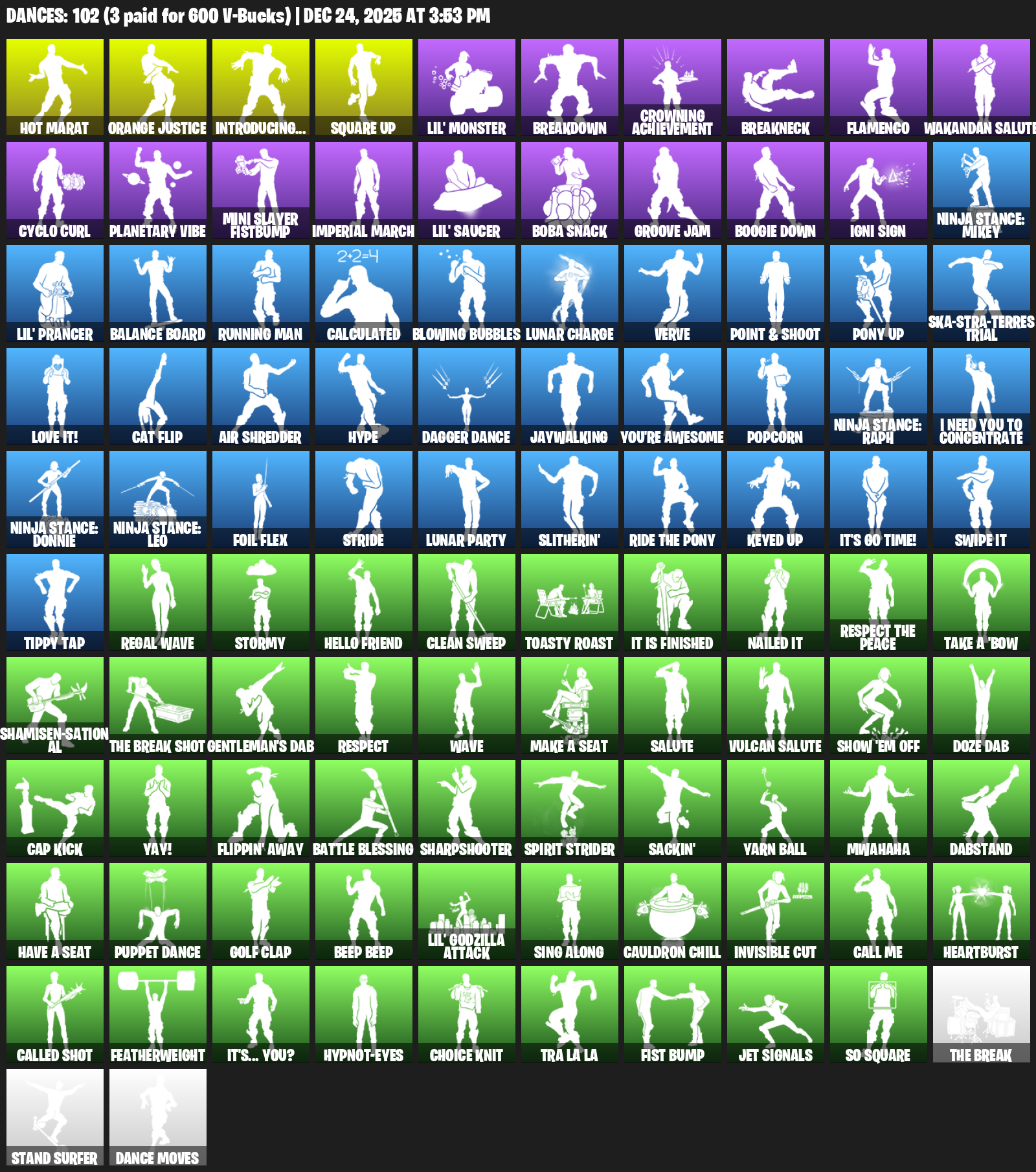 Hot Marat, Introducing…, Orange Justice, Square Up, Lil’ Monster, Breakdown, Crowning Achievement, Breakneck, Flamenco, Wakandan Salute, Cyclo Curl, Planetary Vibe, Mini Slayer Fistbump, Imperial March, Boba Snack, Groove Jam, Boogie Down, Igni Sign, Ninja Stance: Mikey