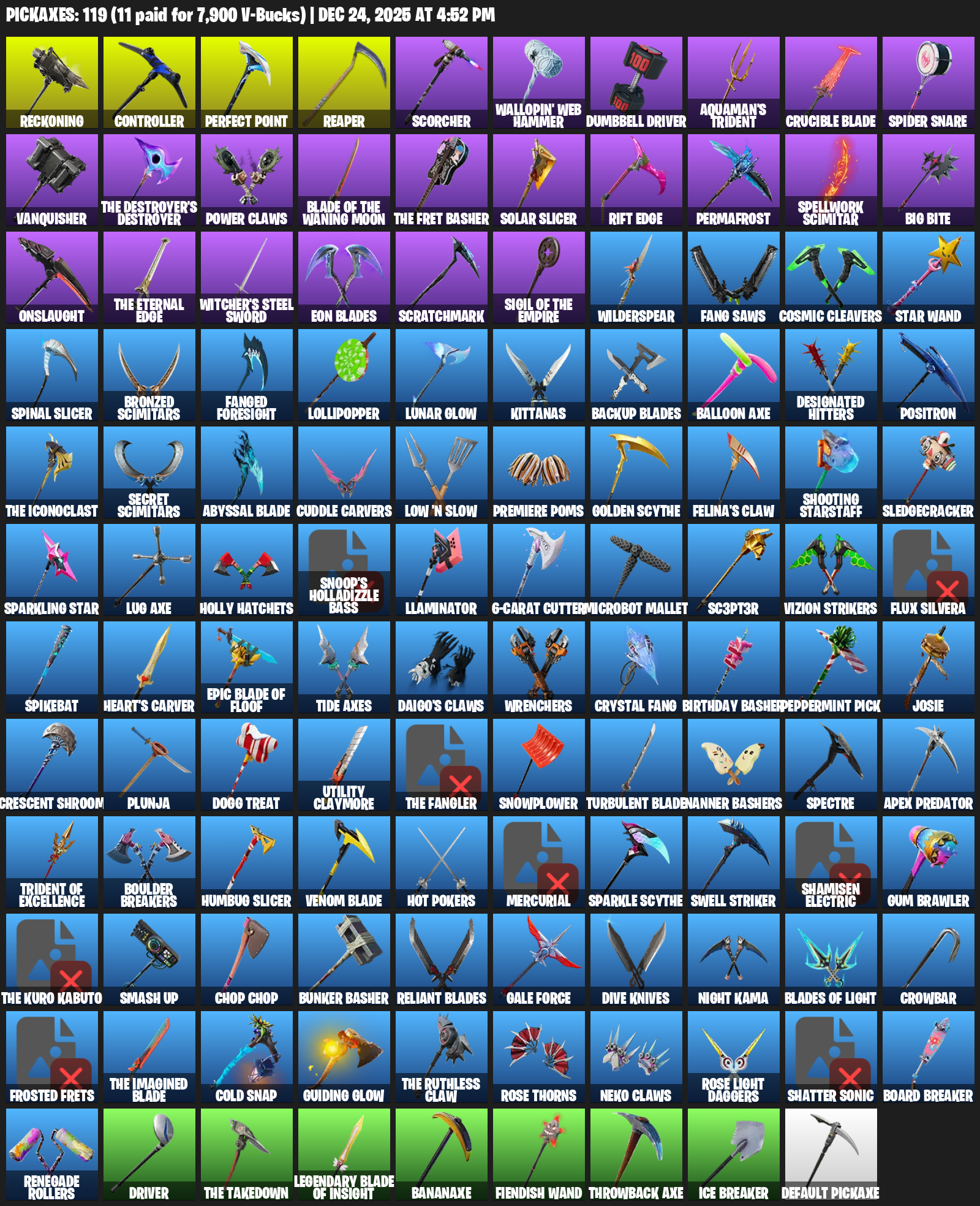 Reckoning, Controller, Reaper, Scorcher, Wallopin’ Web Hammer, Dumbbell Driver, Aquaman’s Trident, Crucible Blade, Spider Snare, Vanquisher, Power Claws, Solar Slicer, Rift Edge, Permafrost, Spellwork Scimitar, Big Bite
