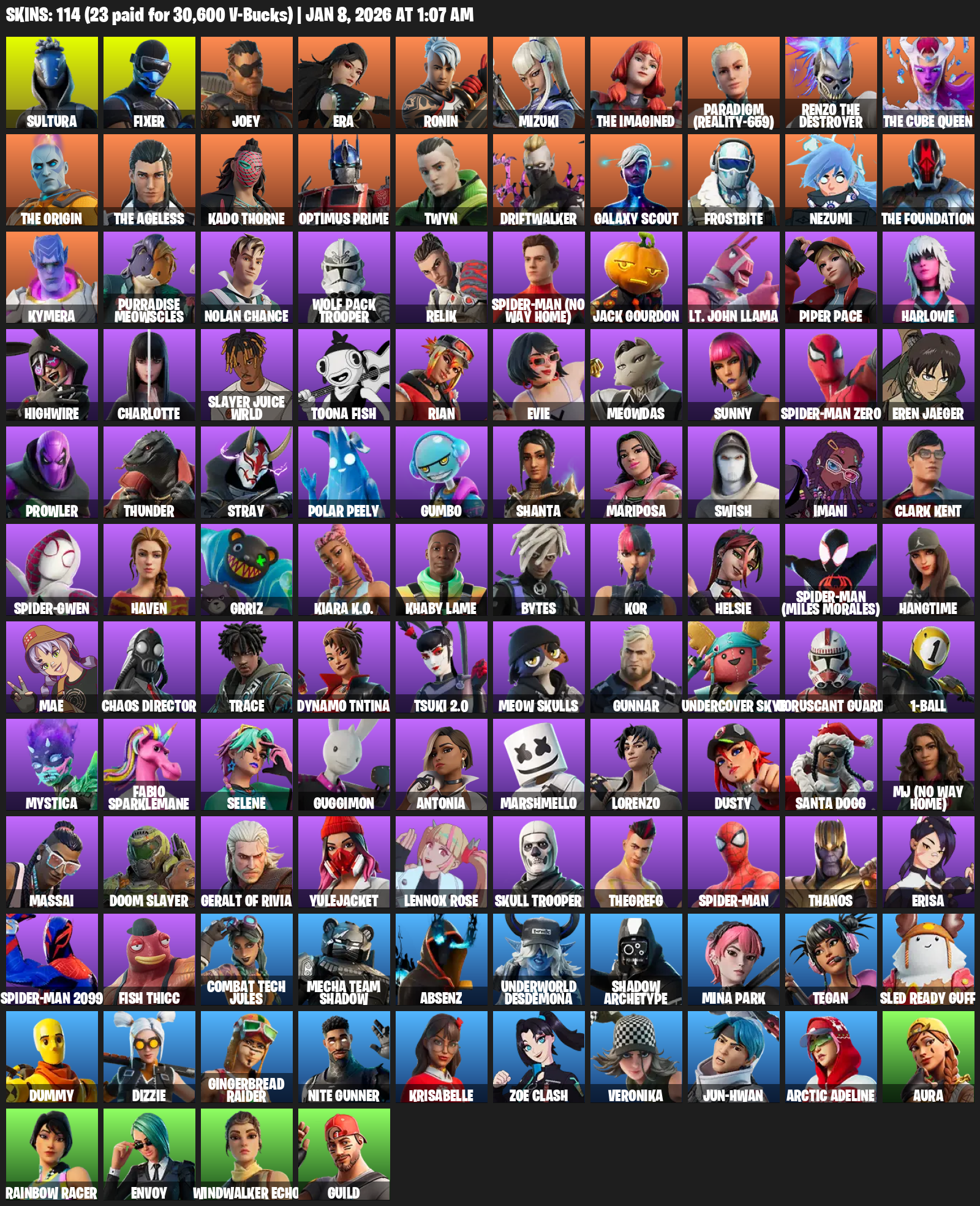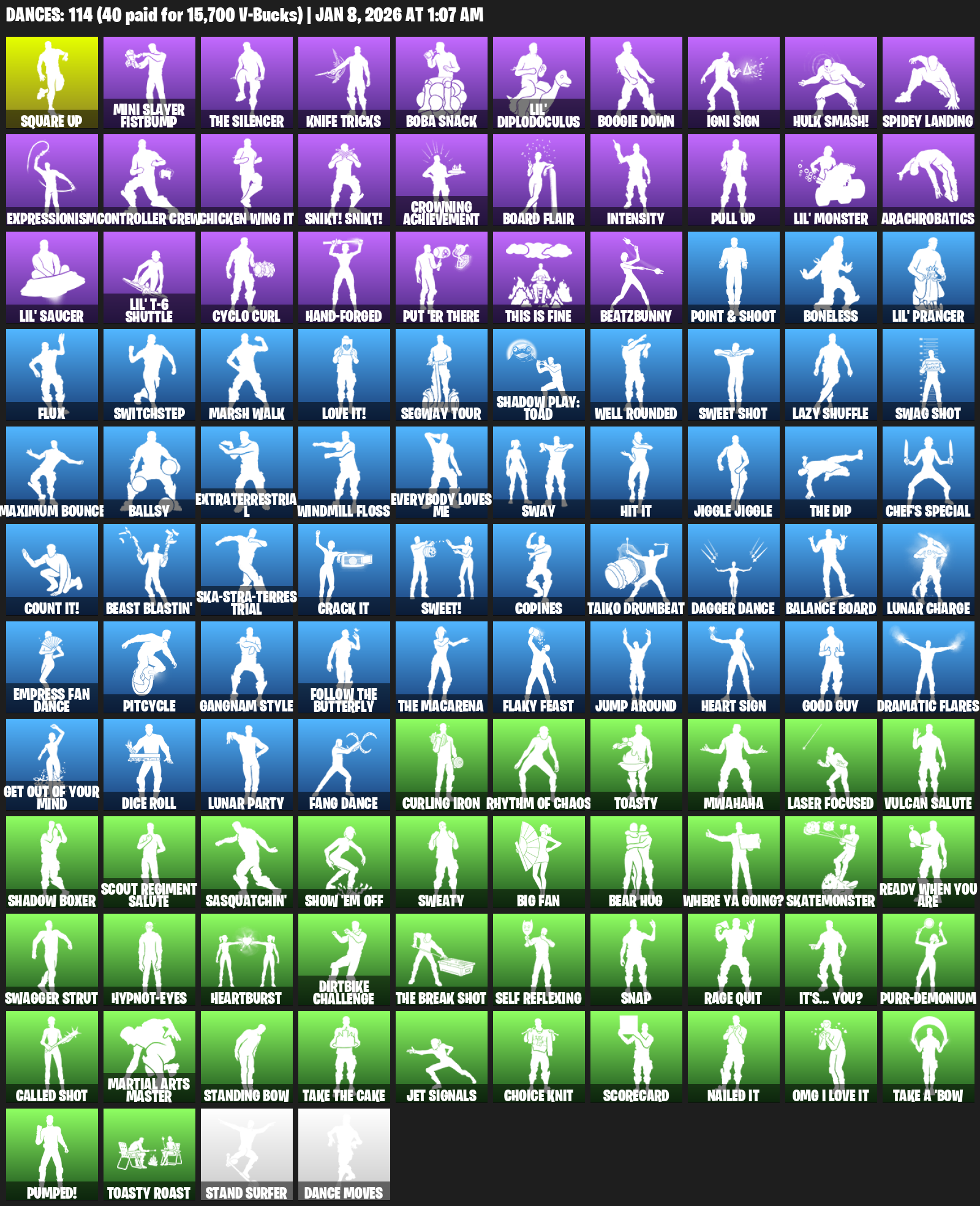 Square Up, Mini Slayer Fistbump, Knife Tricks, Boba Snack, Lil’ Diplodoculus, Boogie Down, Igni Sign, HULK SMASH!, Spidey Landing, Expressionism, Controller Crew, Chicken Wing It, Snikt! Snikt!, Crowning Achievement, Board Flair, Intensity, Arachrobatics