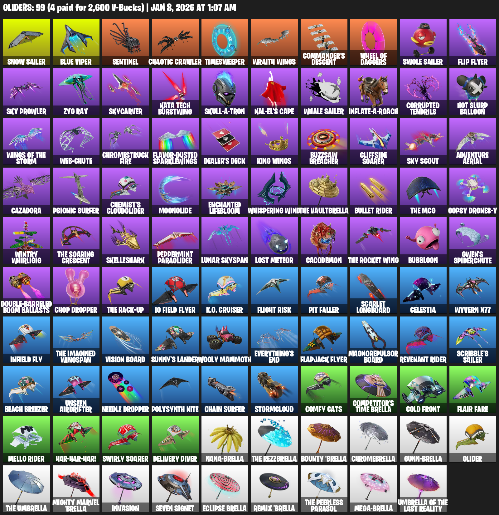 Snow Sailer, Blue Viper, Sentinel, Chaotic Crawler, Timesweeper, Wraith Wings, Commander’s Descent, Flip Flyer, Sky Prowler, Zyg Ray, Skycarver, Kata Tech Burstwing, Skull-a-tron, Kal-El’s Cape, Hot Slurp Balloon