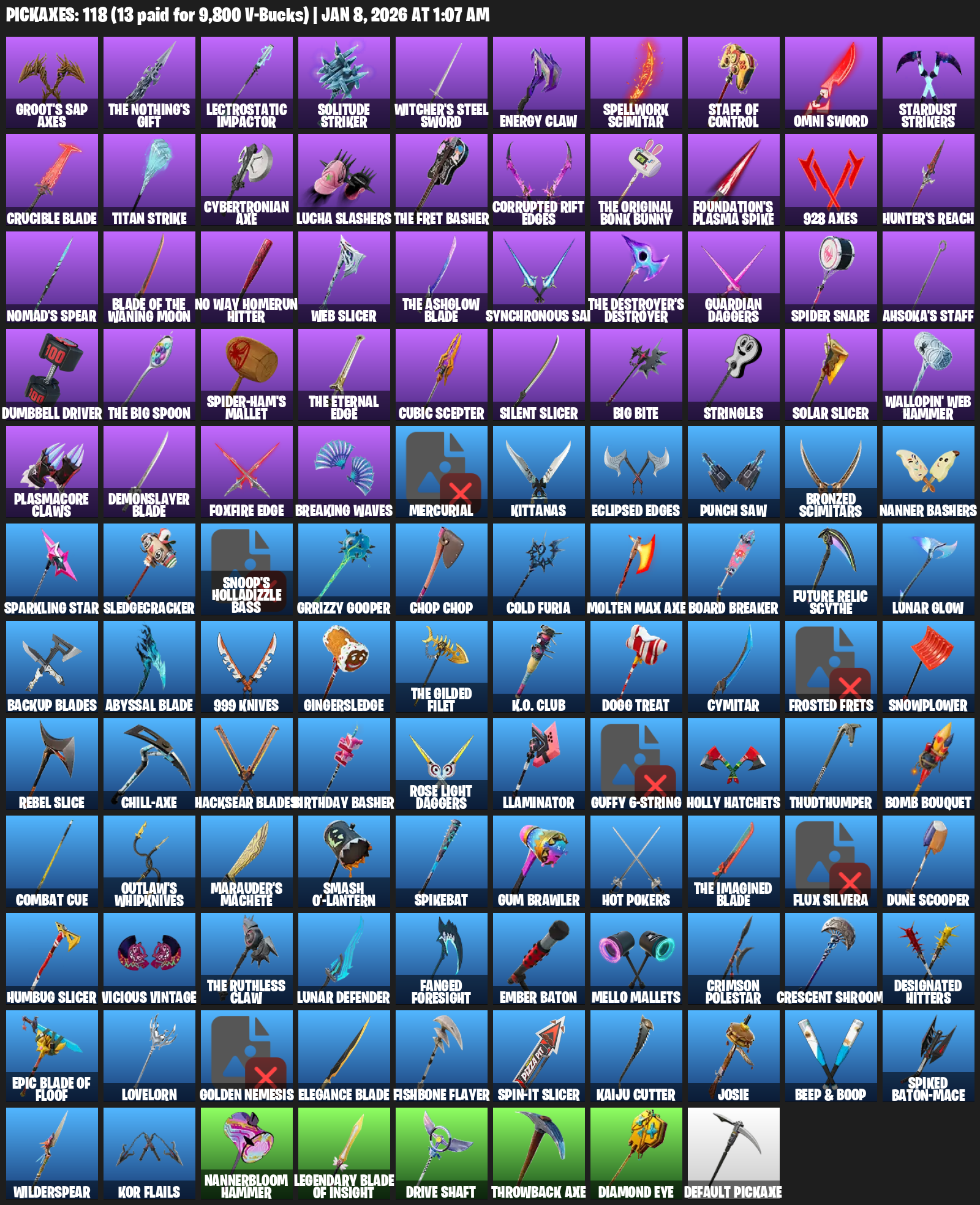 Groot’s Sap Axes, Lectrostatic Impactor, Solitude Striker, Witcher’s Steel Sword, Energy Claw, Spellwork Scimitar, Staff of Control, Stardust Strikers, Crucible Blade, Titan Strike, Cybertronian Axe, Lucha Slashers, Corrupted Rift Edges, Foundation’s Plasma Spike, Hunter’s Reach