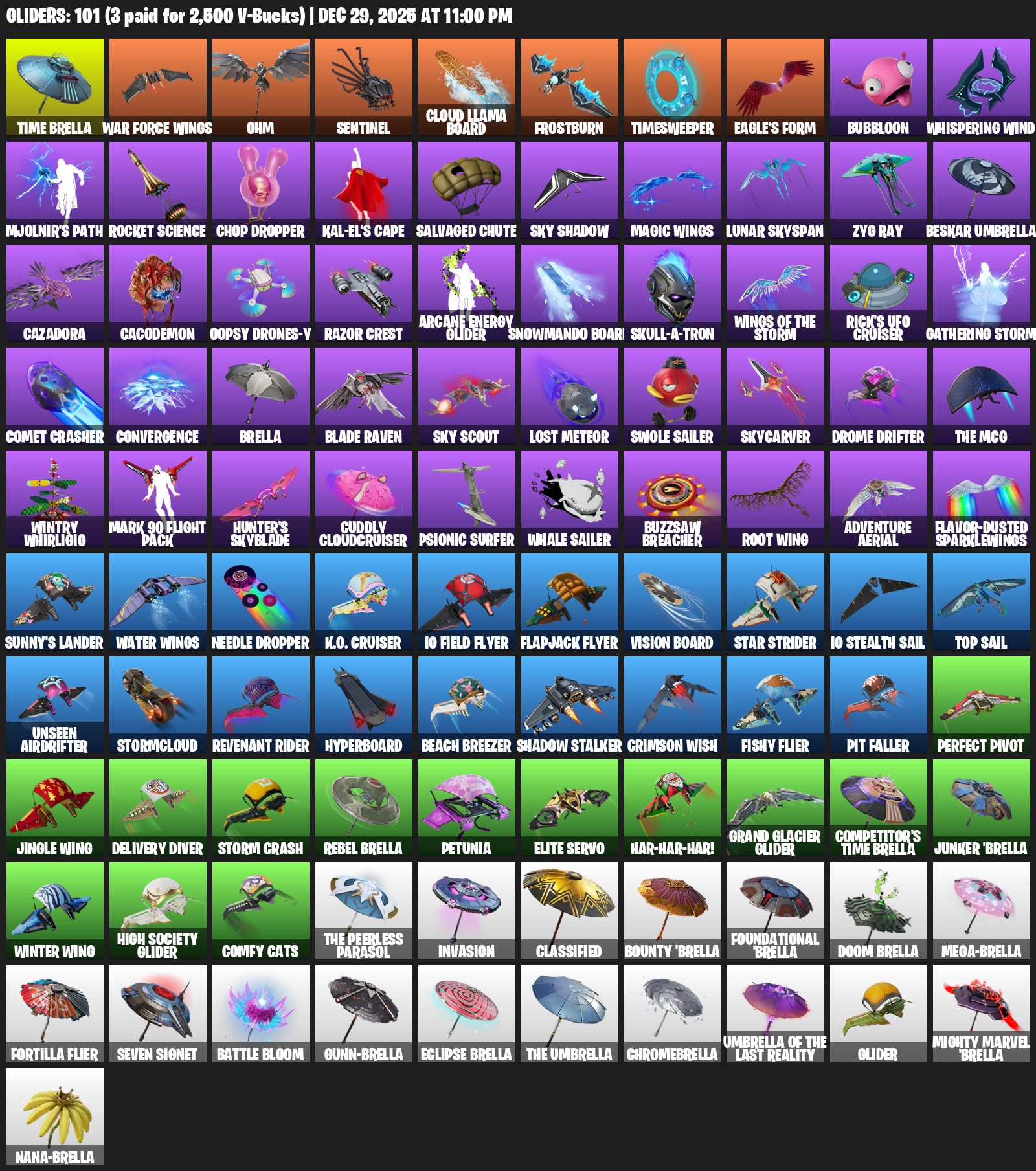 Time Brella, War Force Wings, Ohm, Sentinel, Cloud Llama Board, Frostburn, Timesweeper, Eagle’s Form, Bubbloon, Whispering Wind, Mjolnir’s Path, Rocket Science, Chop Dropper, Kal-El’s Cape, Salvaged Chute, Sky Shadow, Lunar Skyspan, Beskar Umbrella