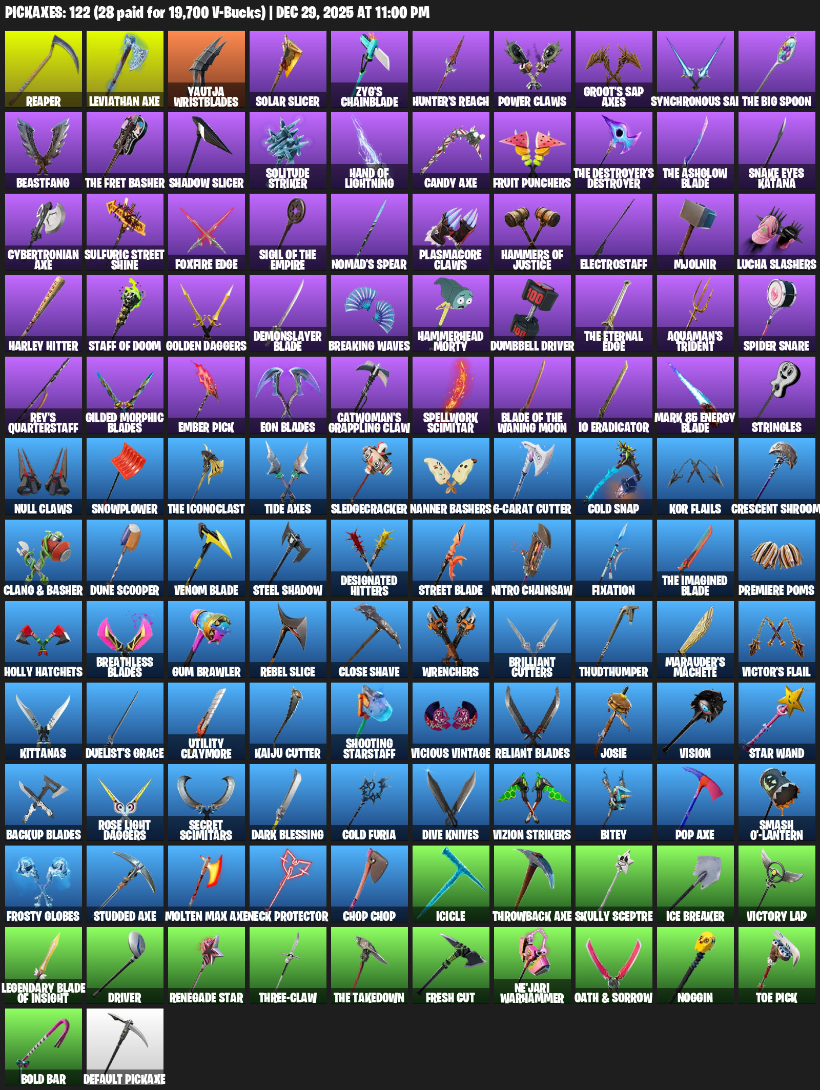 Leviathan Axe, Reaper, Yautja Wristblades, Solar Slicer, Zyg’s Chainblade, Hunter’s Reach, Power Claws, Groot’s Sap Axes, Synchronous Sai, Beastfang, Solitude Striker, Hand of Lightning, Fruit Punchers, Snake Eyes Katana
