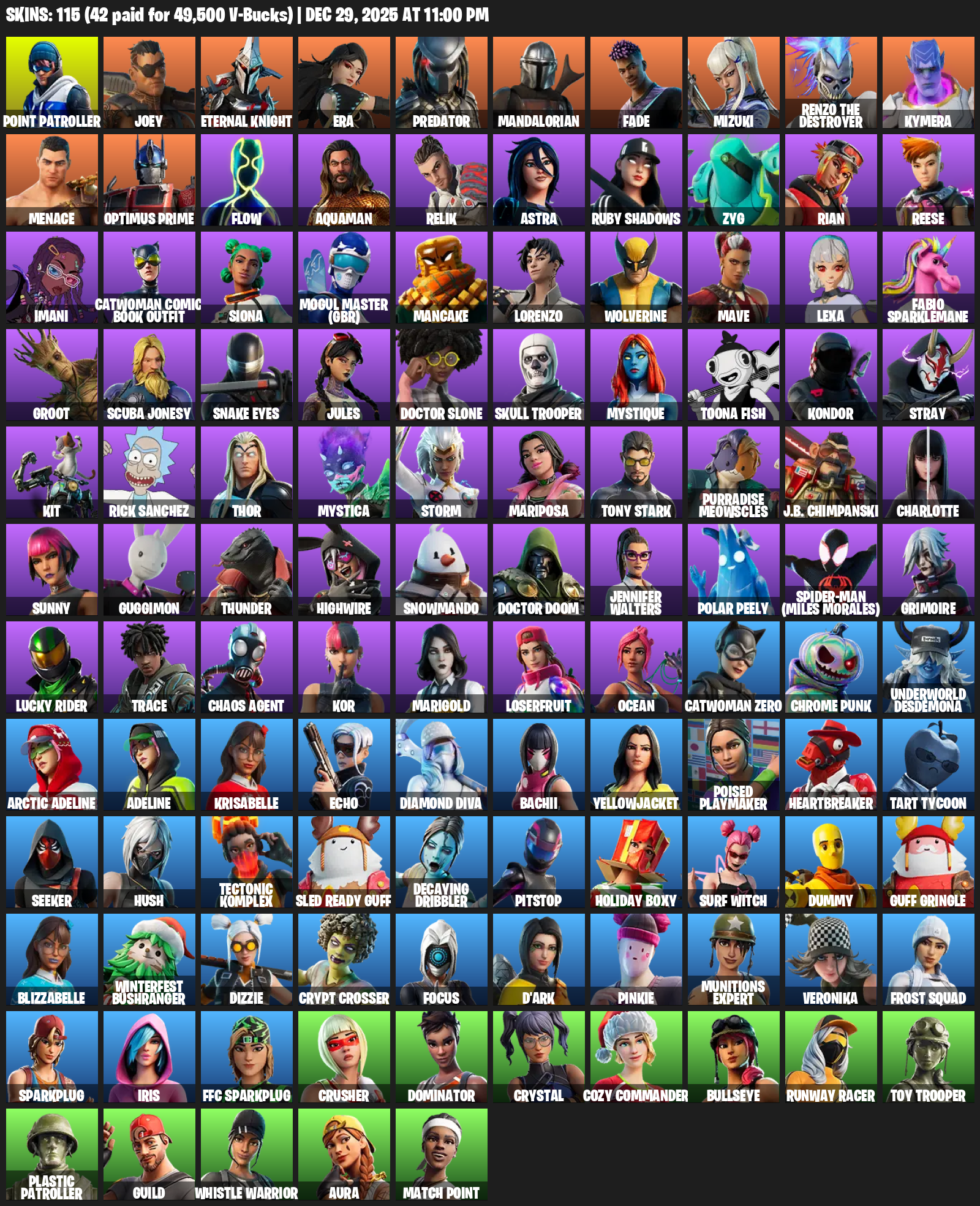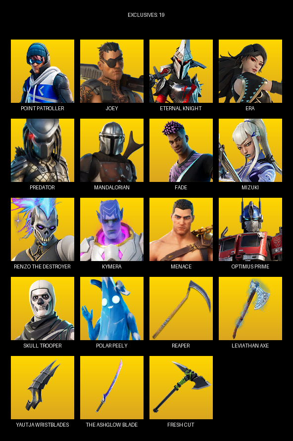 Point Patroller, Joey, Eternal Knight, Era, Predator, Mandalorian, Fade, Mizuki, Renzo the Destroyer, Kymera, Menace, Optimus Prime, Flow, Aquaman, Relik, Astra, Ruby Shadows, Zyg, Rian, Reese
