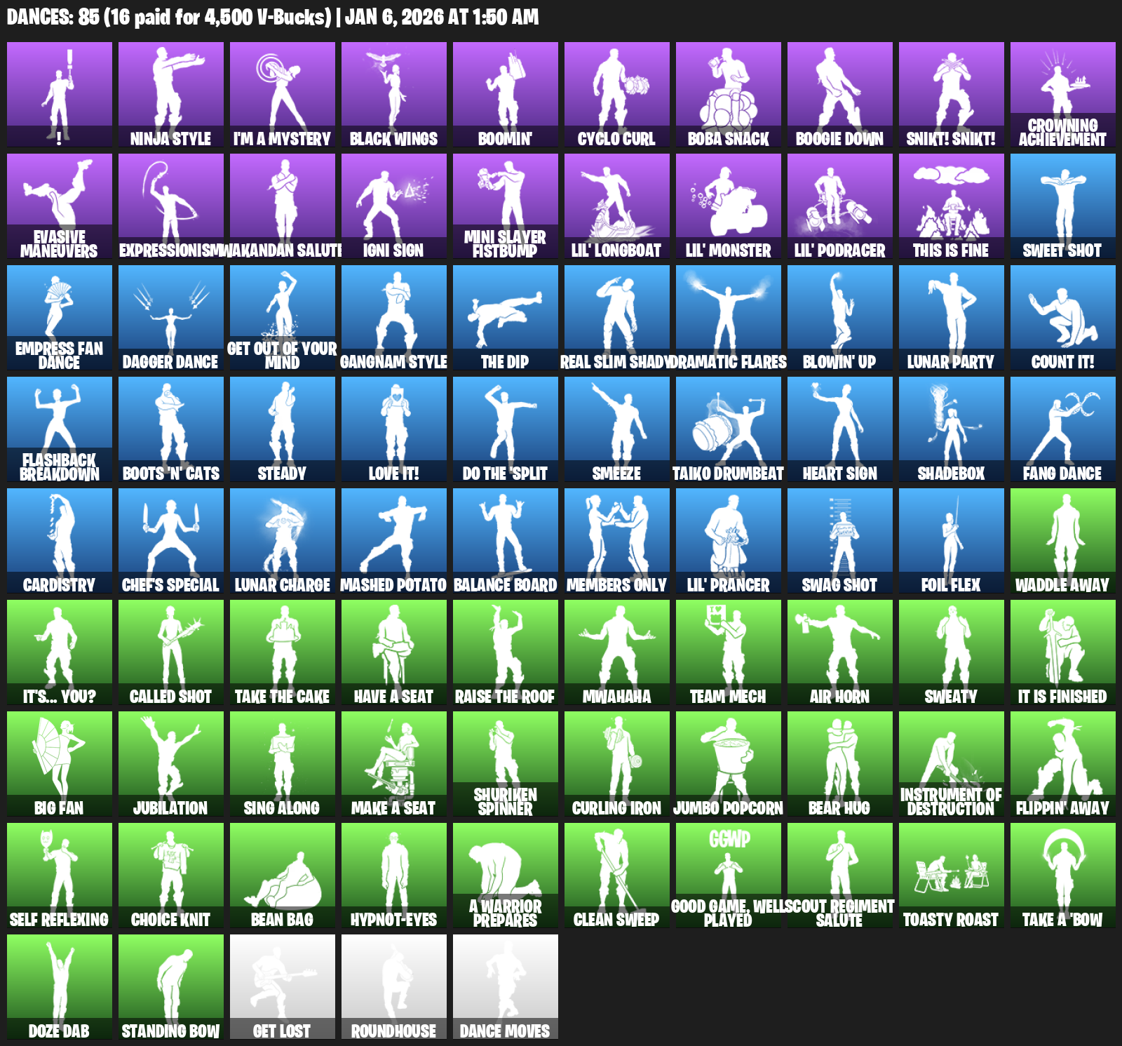 !, Ninja Style, I’m a Mystery, Black Wings, Boomin’, Cyclo Curl, Boba Snack, Boogie Down, Snikt! Snikt!, Crowning Achievement, Evasive Maneuvers, Expressionism, Wakandan Salute, Igni Sign, Mini Slayer Fistbump, Lil’ Longboat, This is Fine, Sweet Shot