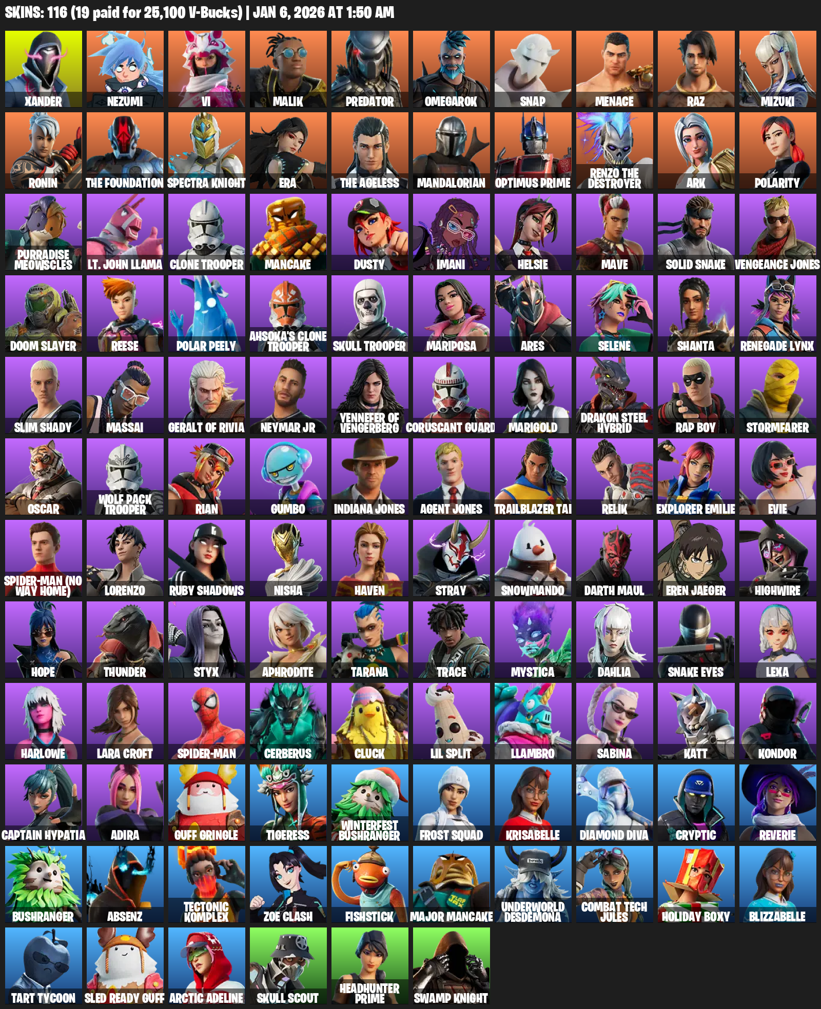 Lara Croft, Xander, Nezumi, Vi, Malik, Predator, Omegarok, Snap, Menace, Raz, Mizuki, Ronin, The Foundation, Spectra Knight, Era, Mandalorian, Optimus Prime, Ark