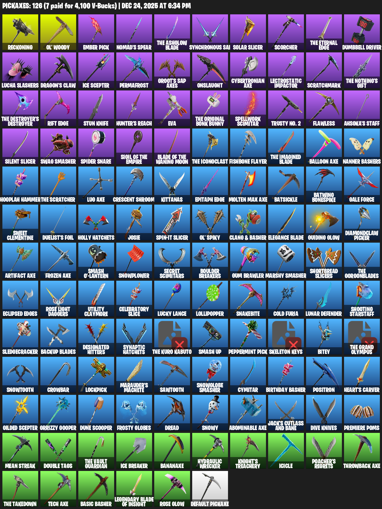 Reckoning, Ol’ Woody, Ember Pick, Nomad’s Spear, Synchronous Sai, Solar Slicer, Scorcher, Dumbbell Driver, Lucha Slashers, Dragon’s Claw, Ice Scepter, Permafrost, Groot’s Sap Axes, Onslaught, Cybertronian Axe, Lectrostatic Impactor, Scratchmark