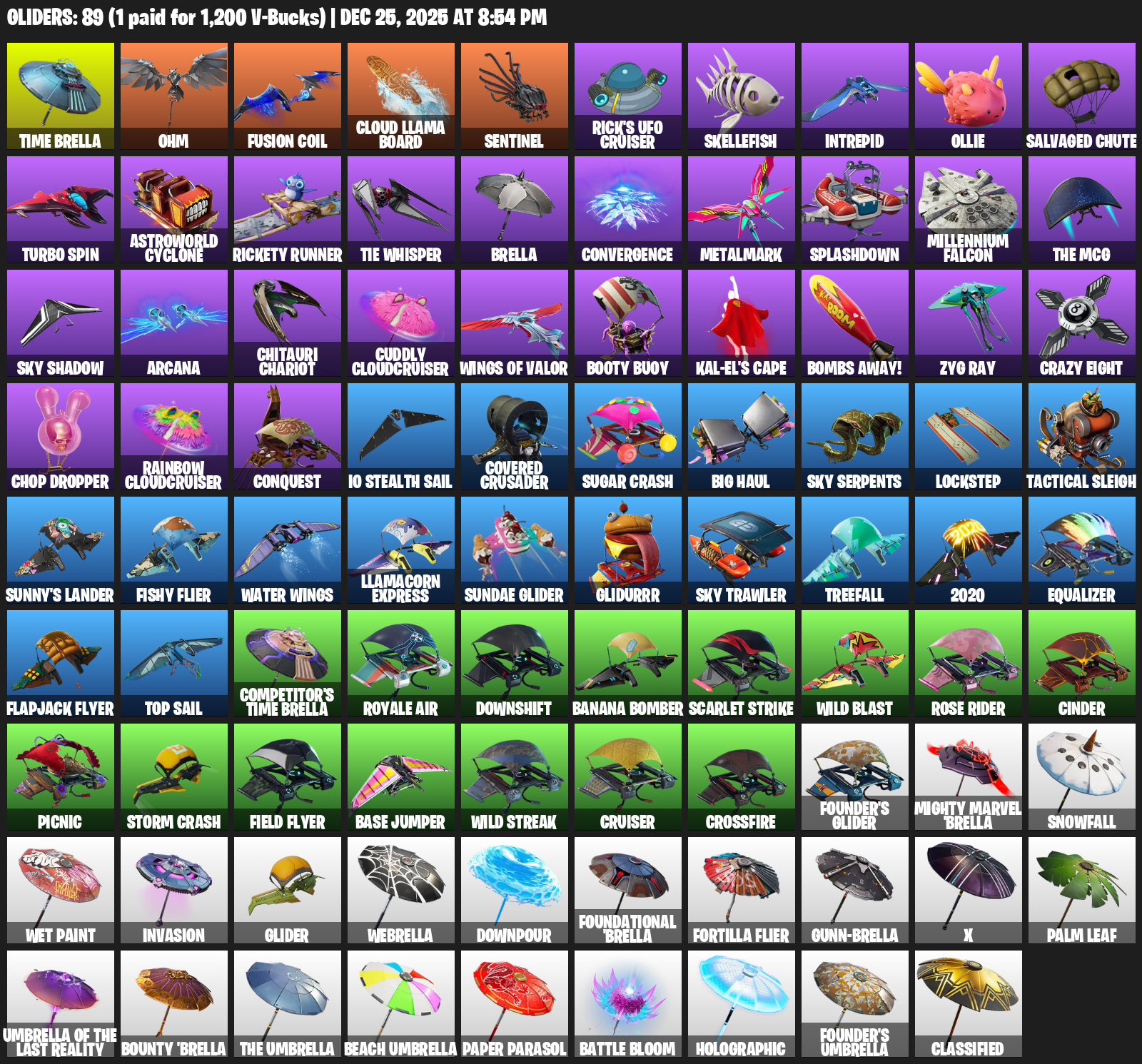 Time Brella, Ohm, Cloud Llama Board, Sentinel, Rick’s UFO Cruiser, Skellefish, Intrepid, Ollie, Salvaged Chute, Turbo Spin, Astroworld Cyclone, Rickety Runner, TIE Whisper, Convergence, Metalmark, Splashdown, Millennium Falcon