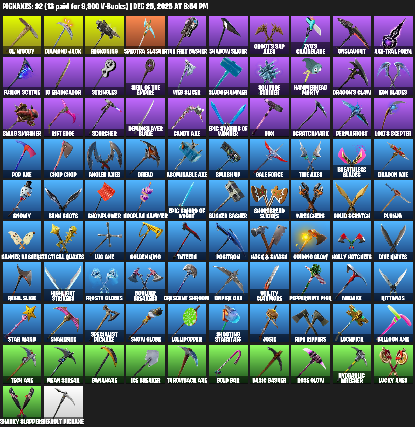 Ol’ Woody, Reckoning, The Fret Basher, Shadow Slicer, Groot’s Sap Axes, Zyg’s Chainblade, Onslaught, Axe-tral Form, Fusion Scythe, IO Eradicator, Stringles, Sludgehammer, Solitude Striker, Hammerhead Morty, Dragon’s Claw, Eon Blades