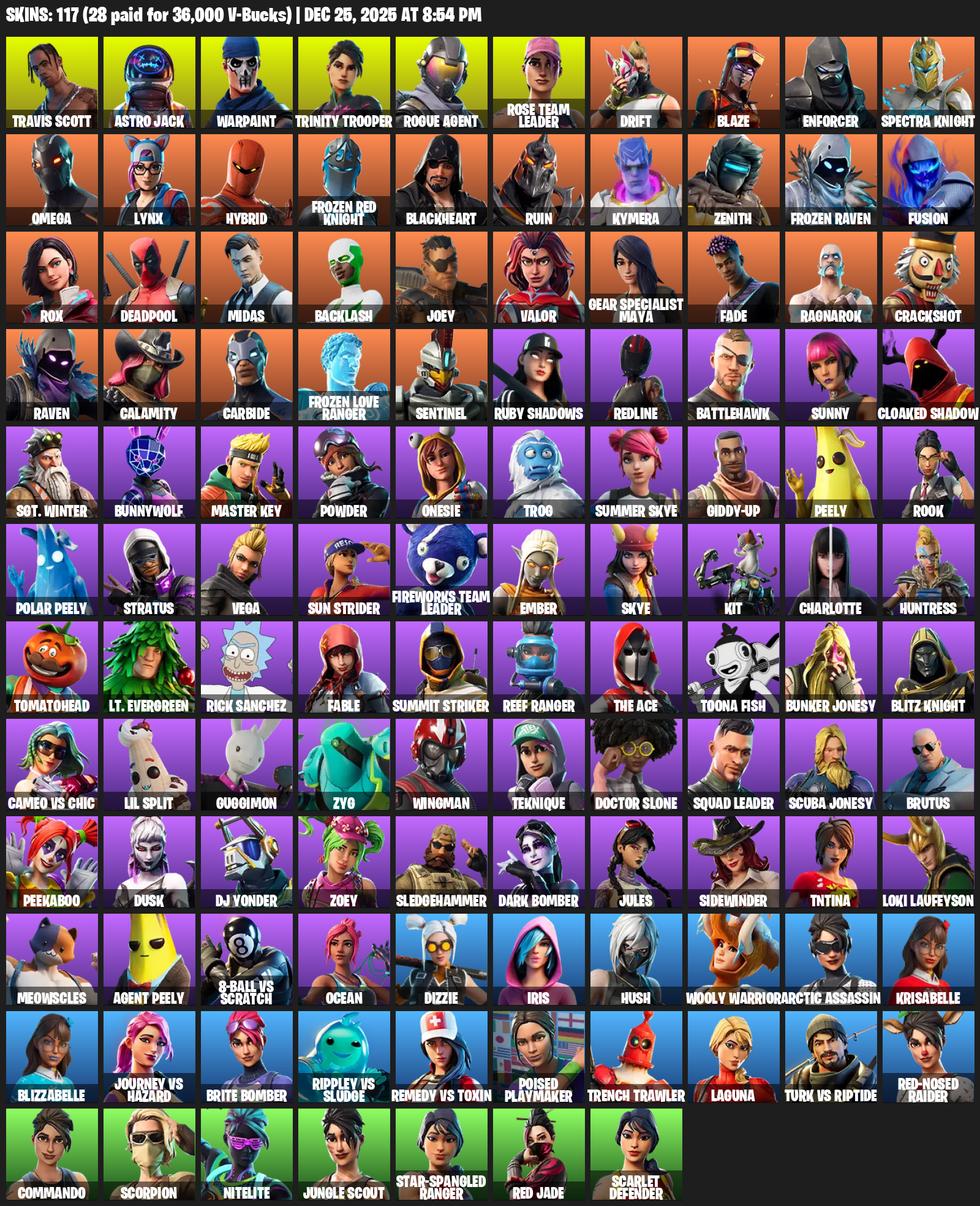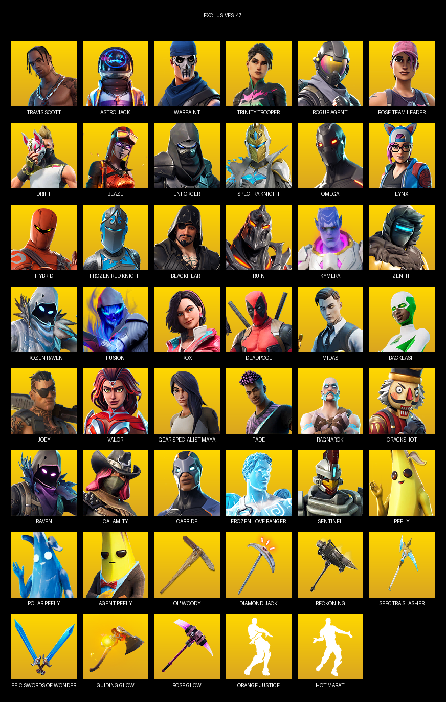Travis Scott, Omega, Gear Specialist Maya, Astro Jack, Warpaint, Trinity Trooper, Rogue Agent, Rose Team Leader, Drift, Blaze, Enforcer, Spectra Knight, Lynx, Hybrid, Blackheart, Ruin, Kymera, Zenith, Frozen Raven