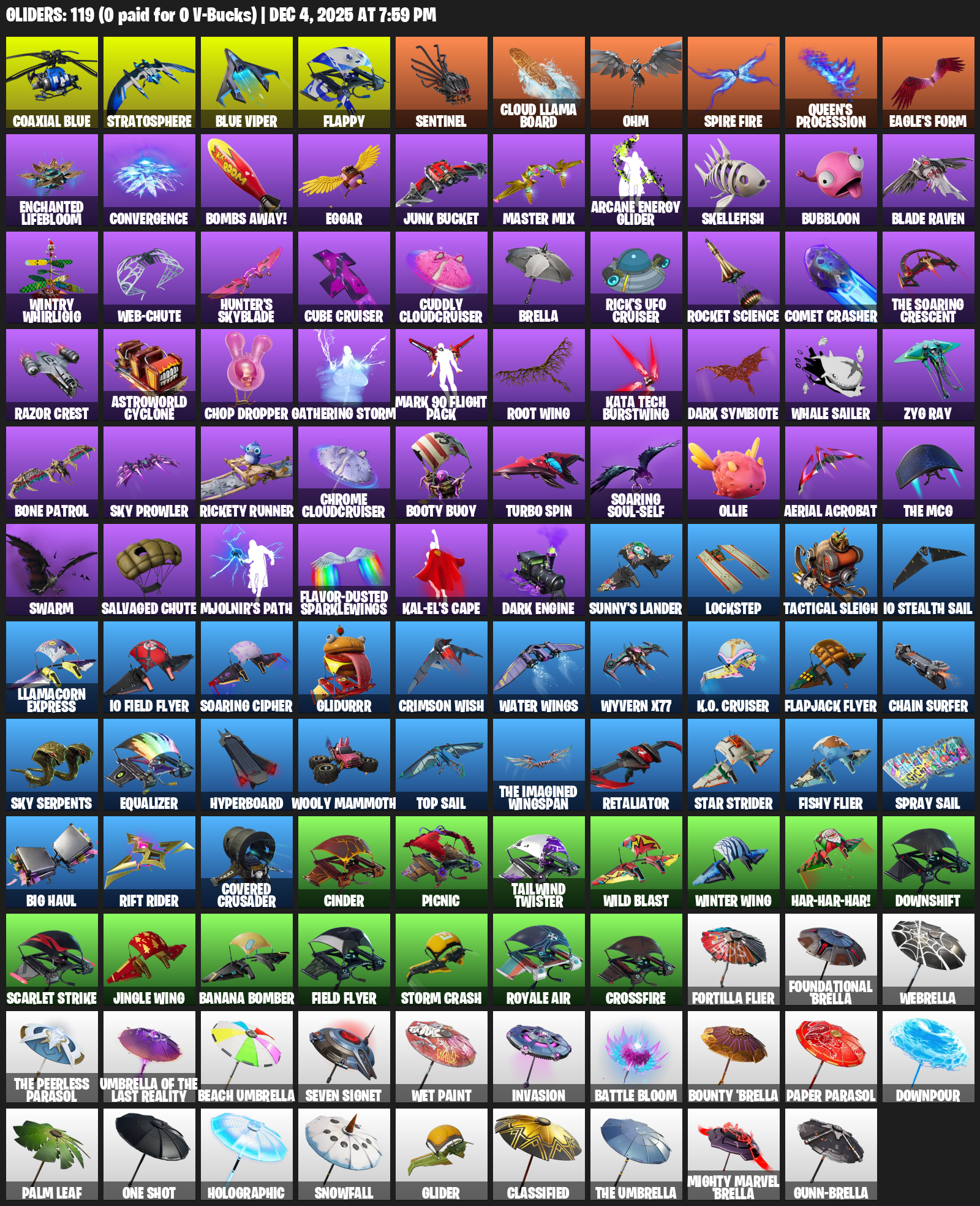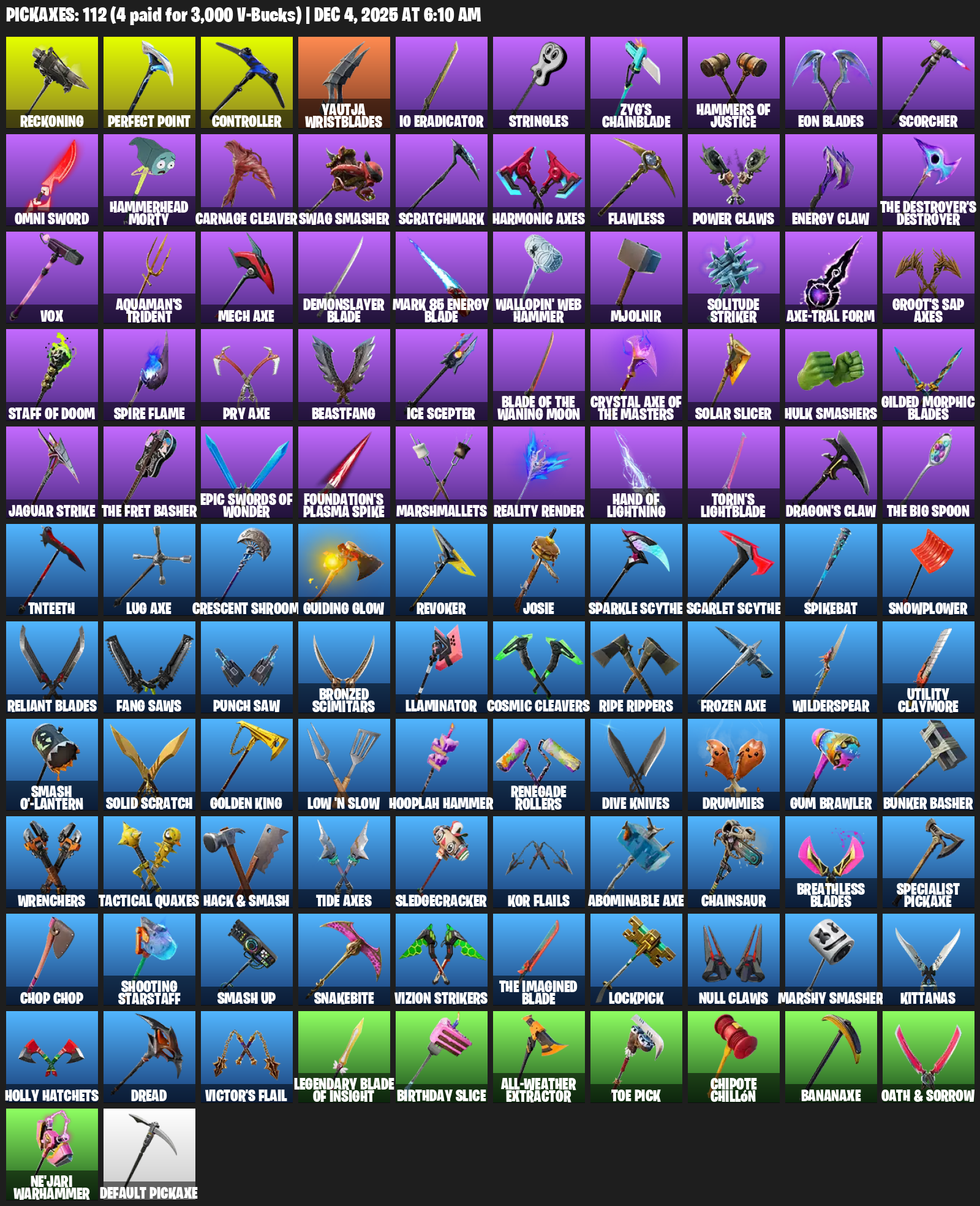 Reckoning, Perfect Point, Controller, Yautja Wristblades, IO Eradicator, Stringles, Zyg’s Chainblade, Hammers of Justice, Eon Blades, Scorcher, Omni Sword, Hammerhead Morty, Carnage Cleaver, Swag Smasher, Scratchmark, Harmonic Axes, Flawless, Power Claws, Energy Claw