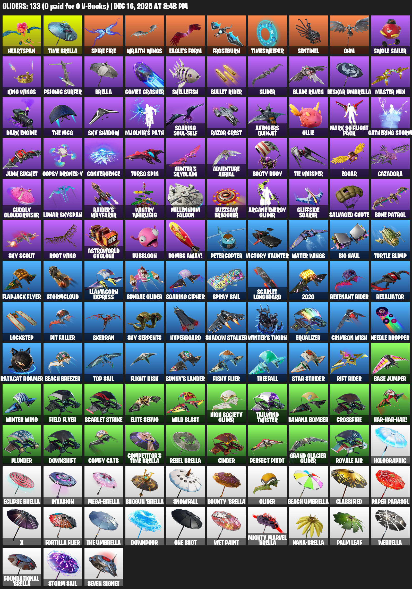 Heartspan, Time Brella, Spire Fire, Wraith Wings, Eagle’s Form, Frostburn, Timesweeper, Ohm, Swole Sailer, Psionic Surfer, Comet Crasher, Skellefish, Bullet Rider, Slider, Beskar Umbrella