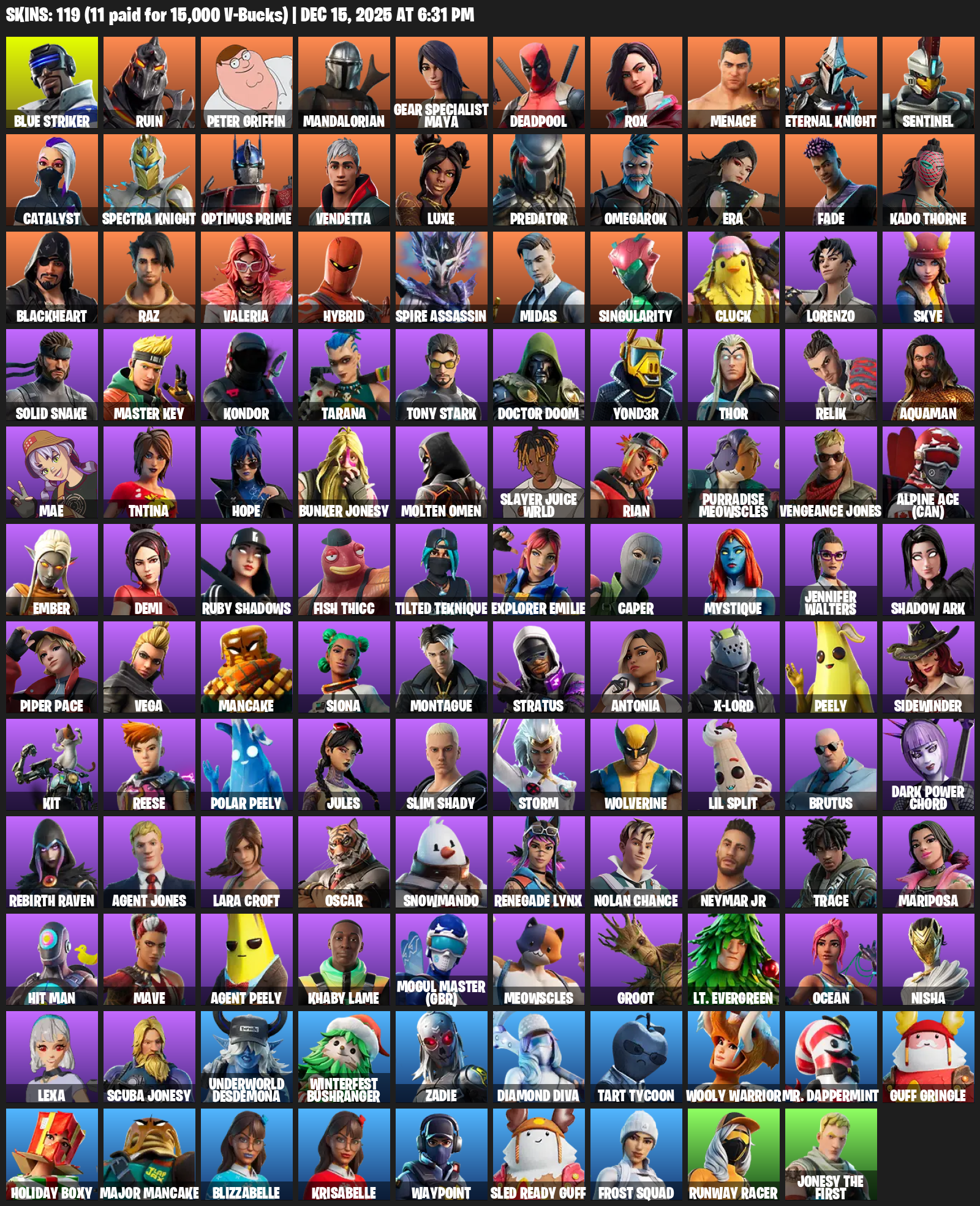 Gear Specialist Maya, Lara Croft, Blue Striker, Ruin, Peter Griffin, Mandalorian, Deadpool, Rox, Menace, Eternal Knight, Sentinel, Catalyst, Optimus Prime, Vendetta, Luxe, Predator, Omegarok, Era, Fade