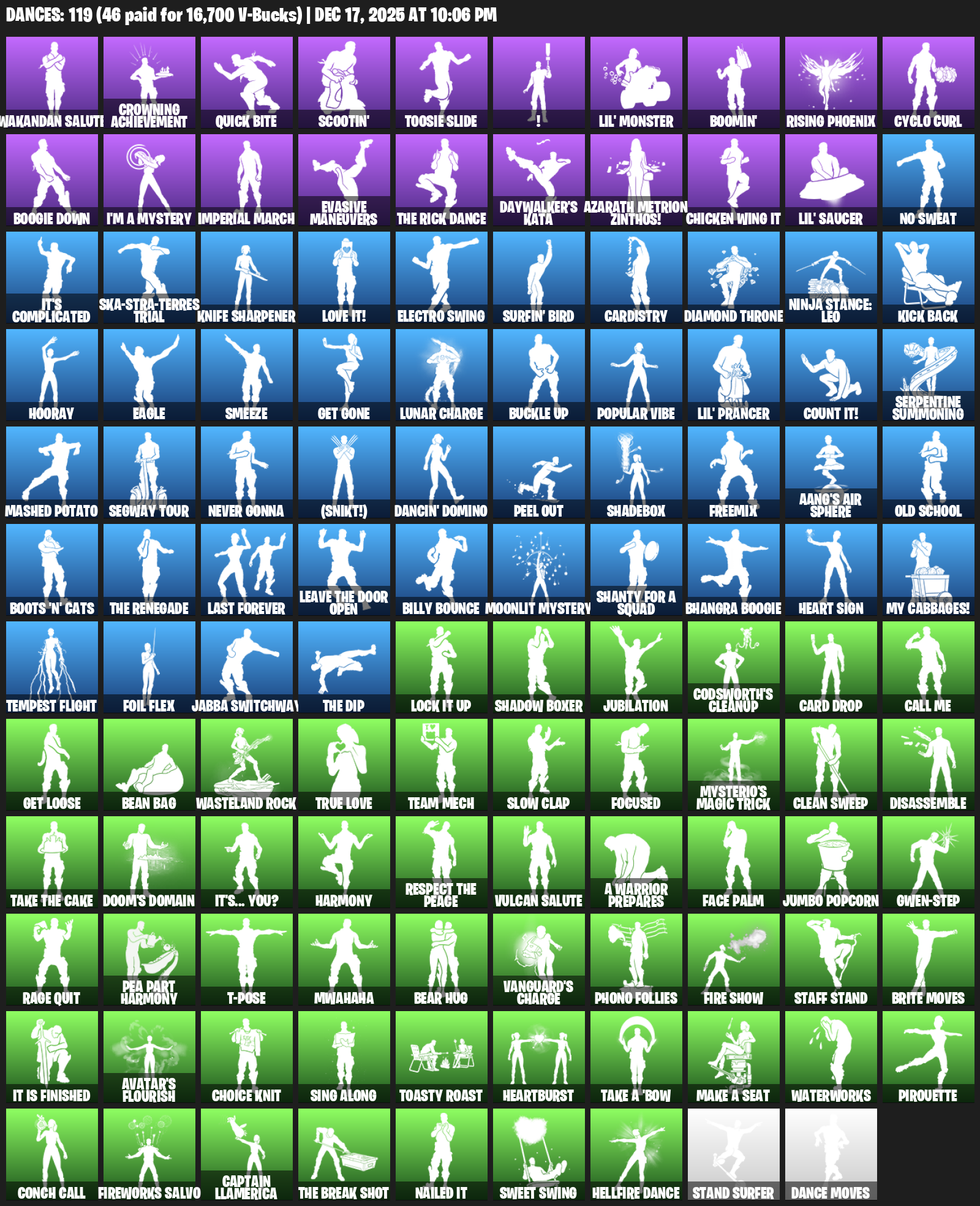 Wakandan Salute, Crowning Achievement, Quick Bite, Scootin’, Toosie Slide, !, Lil’ Monster, Boomin’, Rising Phoenix, Cyclo Curl, Boogie Down, I’m a Mystery, Imperial March, Evasive Maneuvers, Daywalker’s Kata, Azarath Metrion Zinthos!, Chicken Wing It, No Sweat