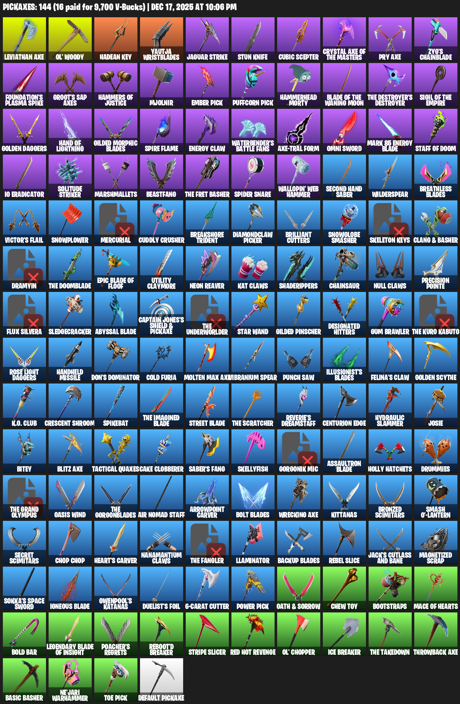 Leviathan Axe, Ol’ Woody, Hadean Key, Yautja Wristblades, Jaguar Strike, Stun Knife, Cubic Scepter, Zyg’s Chainblade, Foundation’s Plasma Spike, Groot’s Sap Axes, Hammers of Justice, Mjolnir, Ember Pick, Hammerhead Morty