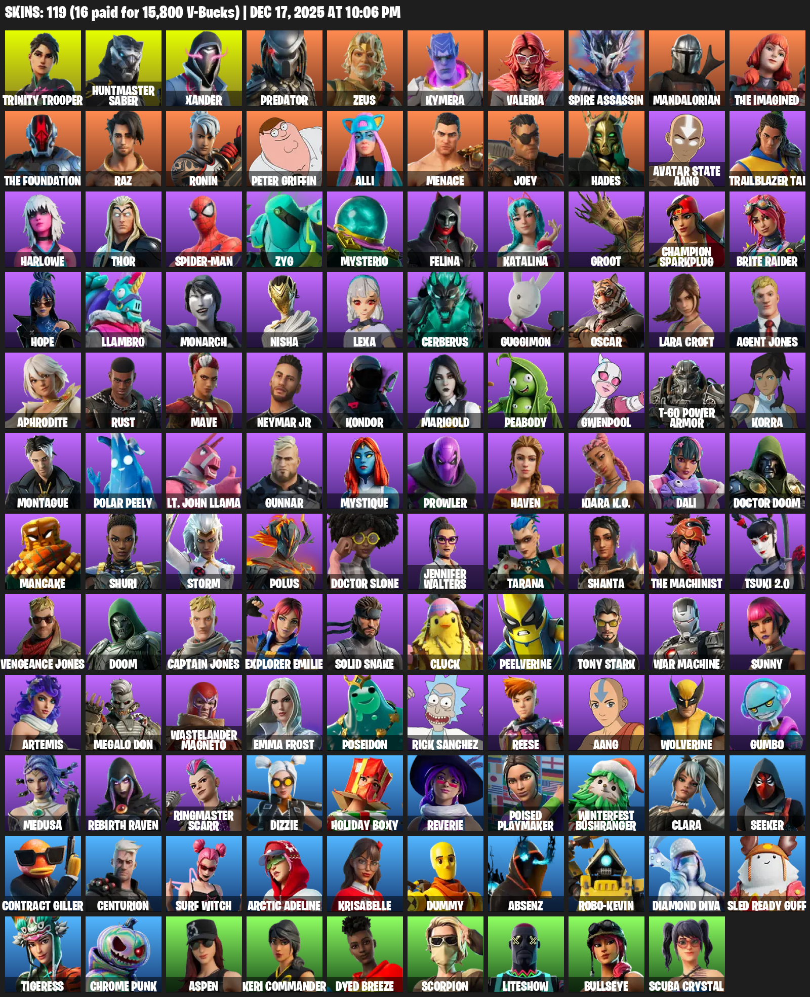 Lara Croft, Trinity Trooper, Huntmaster Saber, Xander, Predator, Zeus, Kymera, Valeria, Spire Assassin, Mandalorian, The Imagined, Raz, Ronin, Peter Griffin, Alli, Menace, Joey, Hades, Avatar State Aang